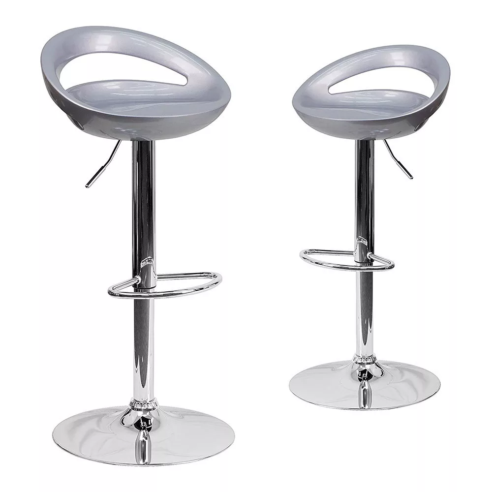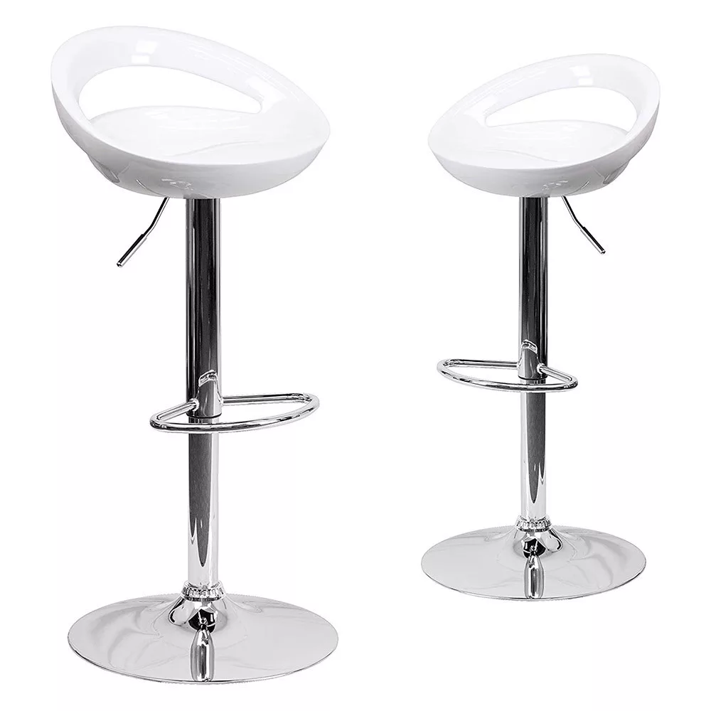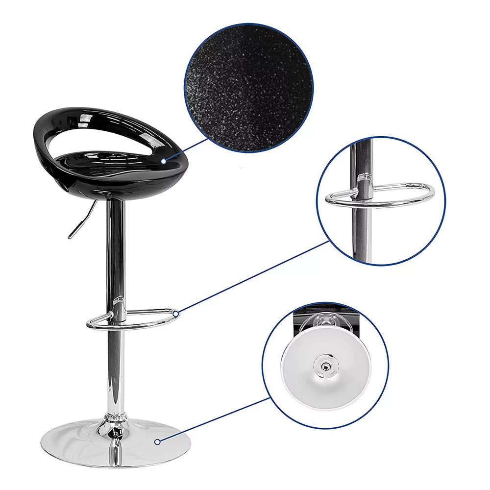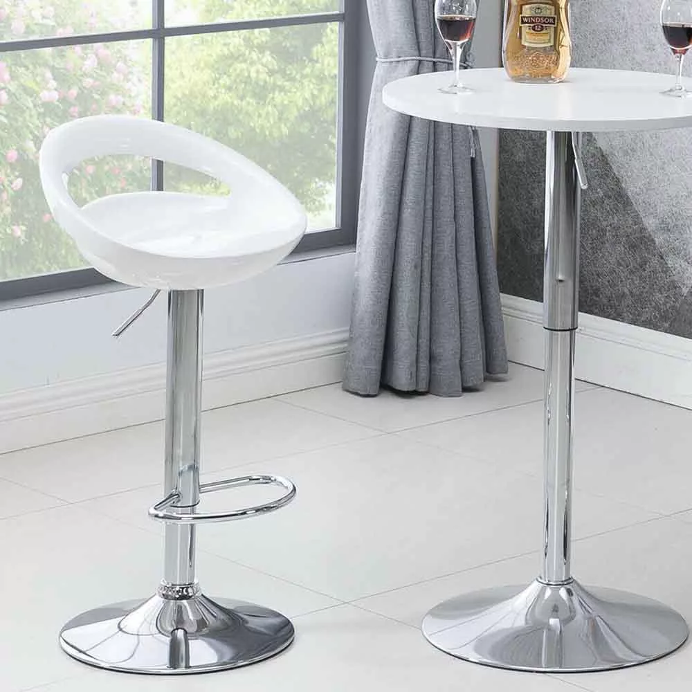 Scaunele pot fi reglate între 76-96 cm pentru a se potrivi diferitelor tipuri de mese și blaturi. Suportul ergonomic pentru picioare și suprafața largă de ședere, cu un diametru de 46 cm, oferă confort chiar și în cazul utilizării îndelungate. Baza cu un diametru de 38 cm asigură stabilitate, iar finisajul lucios adaugă o notă de rafinament.