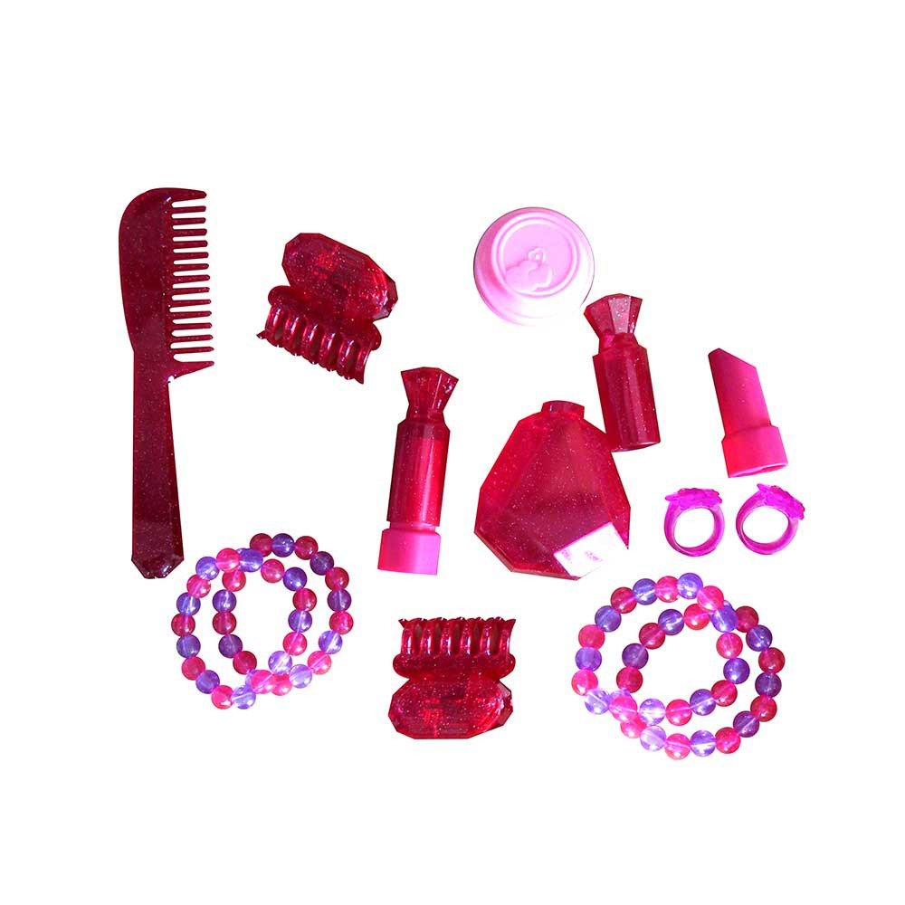 - 13 accesorii, inclusiv: bijuterii, uscător de păr de jucărie și perii pentru păr