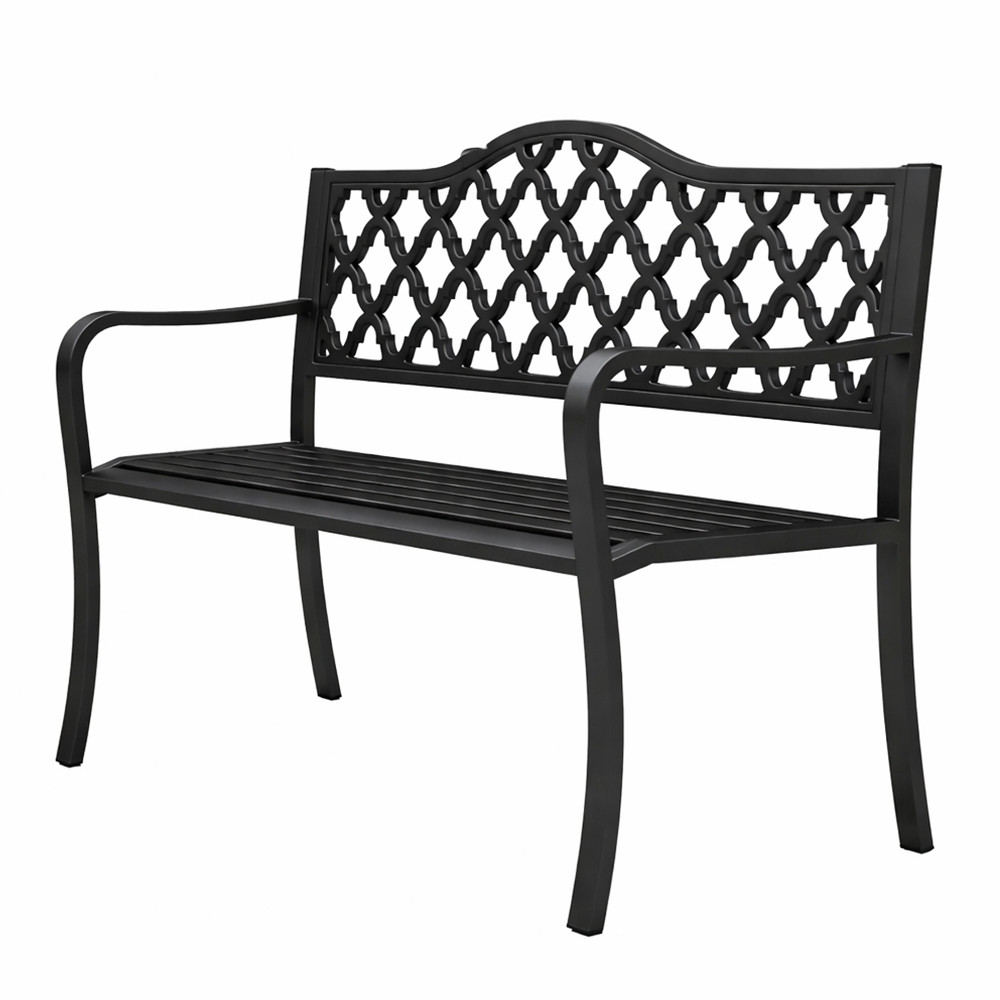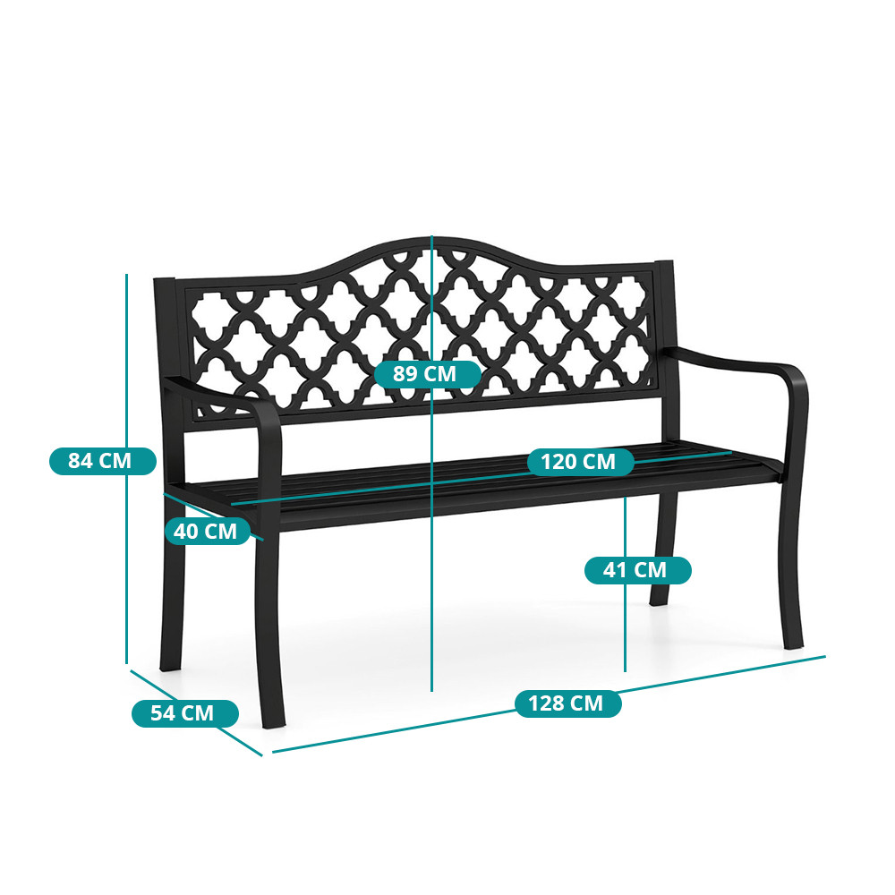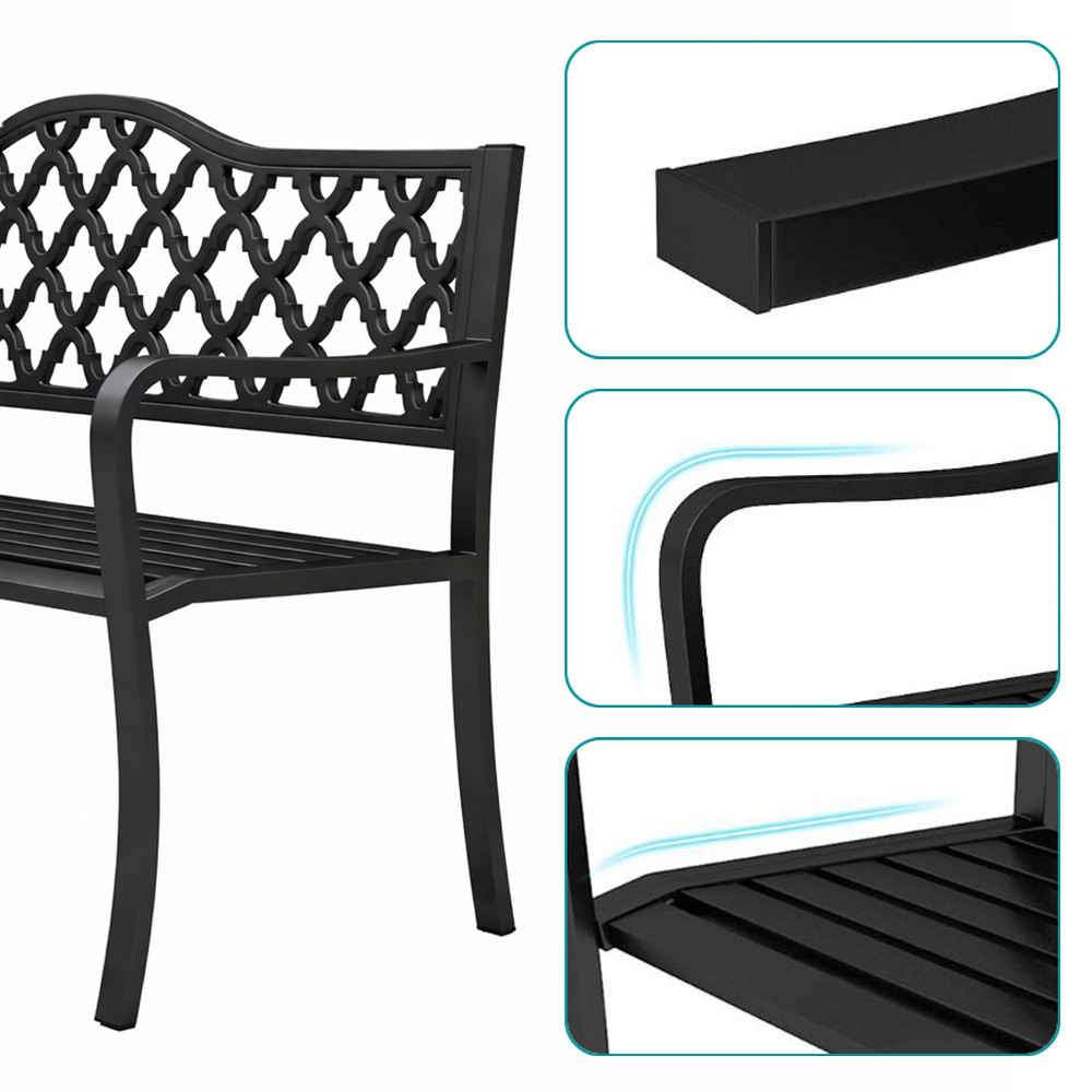 Modelul de pe spătar face banca pur și simplu mai frumoasă, fără a fi ostentativă. Culoarea neagră se potrivește ușor cu majoritatea mobilierului de grădină și balustradelor, facilitând armonizarea cu decorul înconjurător.