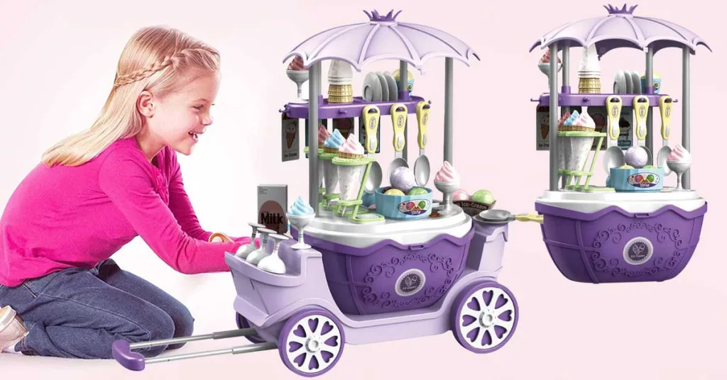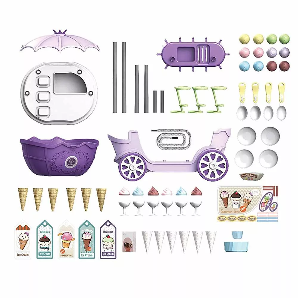 Accesoriile colorate și realiste – cum ar fi globurile de înghețată, cornetele, farfurioarele și lingurițele de jucărie – permit desfășurarea unor jocuri de rol captivante. Astfel, copiii pot deveni vânzători de înghețată imaginari, dezvoltându-și creativitatea și abilitățile sociale.