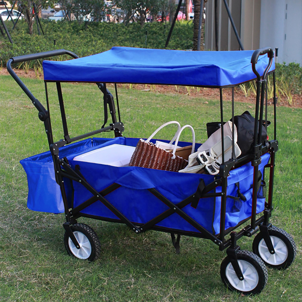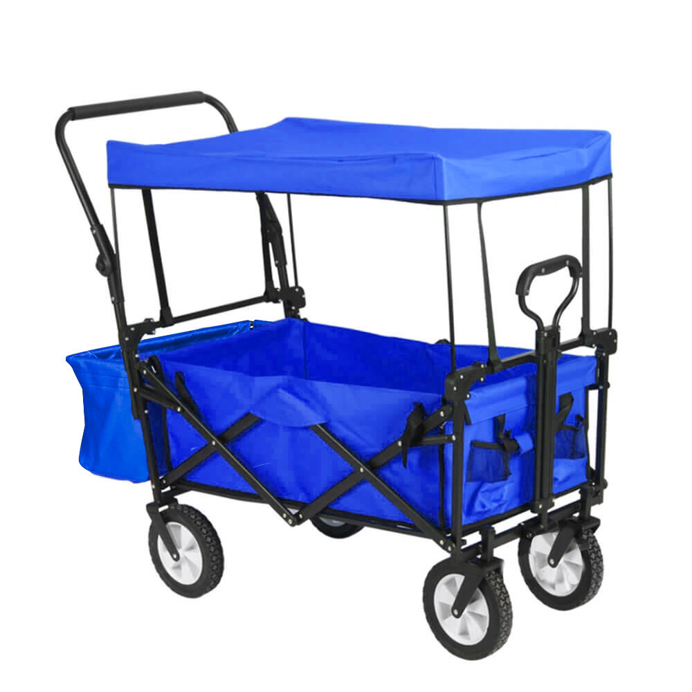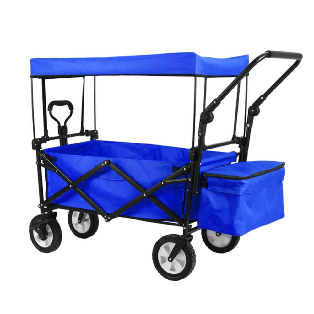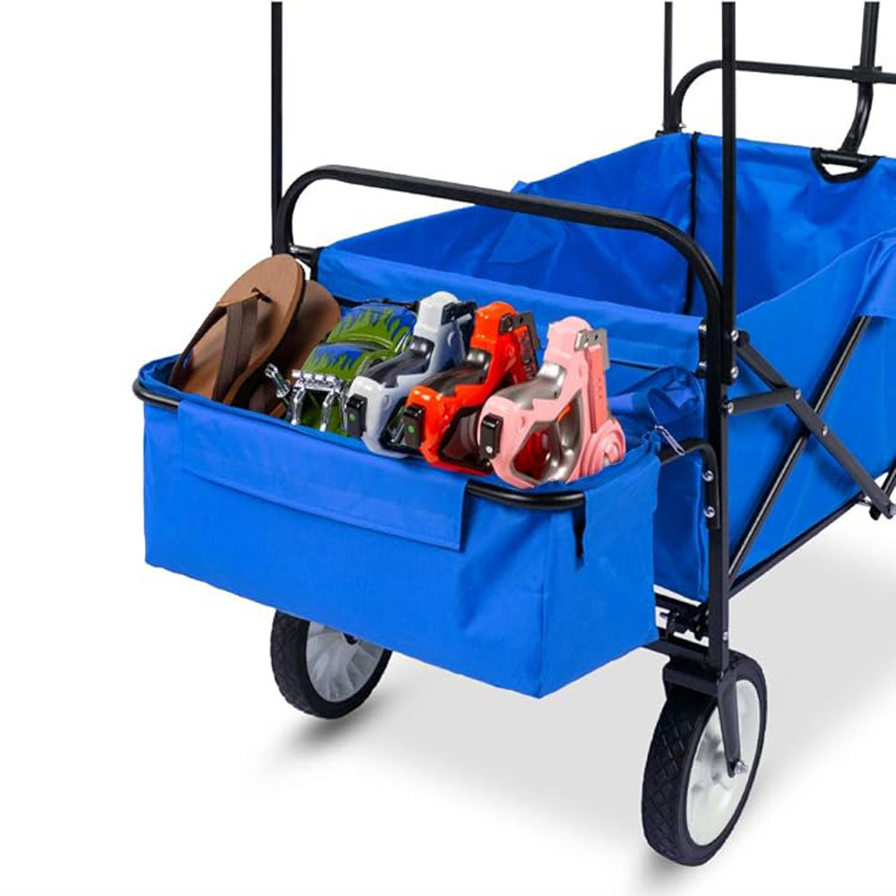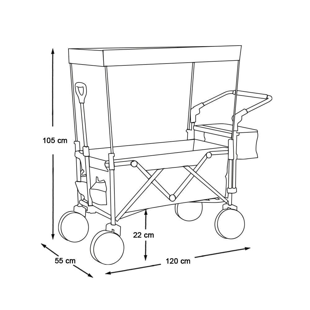 Deși este pliabil, are un spațiu de încărcare surprinzător de generos: compartimentul principal măsoară până la 78×44 cm și este completat de două buzunare laterale mai mici și un compartiment detașabil. Cu o capacitate de 100 kg, poate transporta fără efort echipamente de camping, deșeuri din grădină sau tot ce-ți trebuie pentru plajă. Cadrul metalic solid se pliază rapid, făcându-l ușor de depozitat și de transportat. Încape fără probleme într-un dulap sau în garaj.
