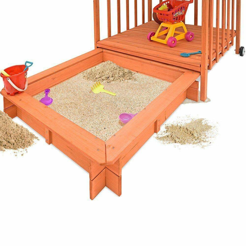 Această căsuță oferă o experiență de joacă completă, combinând un spațiu confortabil de joacă cu o ladă de nisip extensibilă. Lada poate fi trasă cu ușurință de sub căsuță pentru joacă și ascunsă după utilizare, protejând nisipul de murdărie și animale.