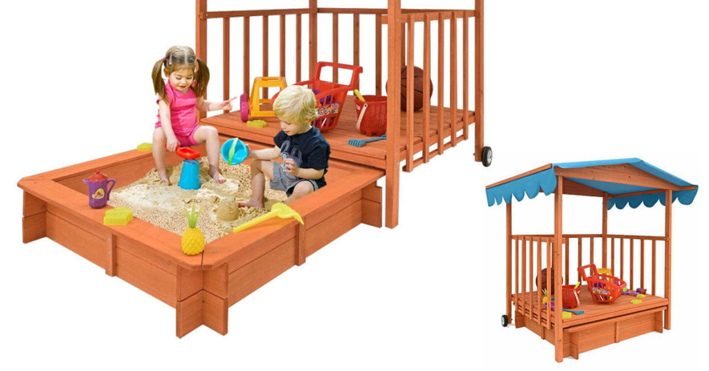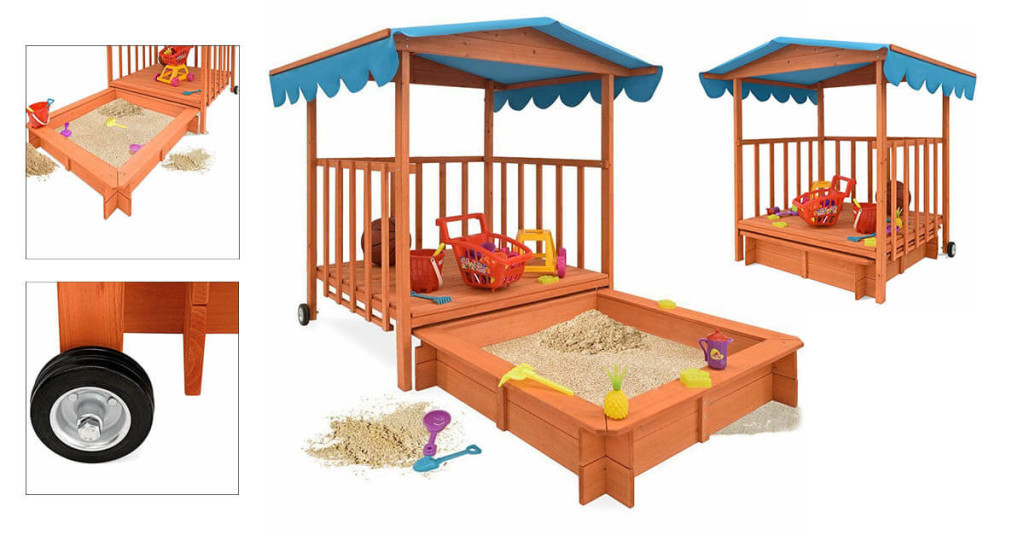 Mecanismul extensibil al lăzii de nisip permite utilizarea optimă a spațiului din grădină. Căsuța este prevăzută cu două roți, facilitând mutarea sa în funcție de necesități. Pereții laterali sunt protejați cu garduri pentru siguranță suplimentară.