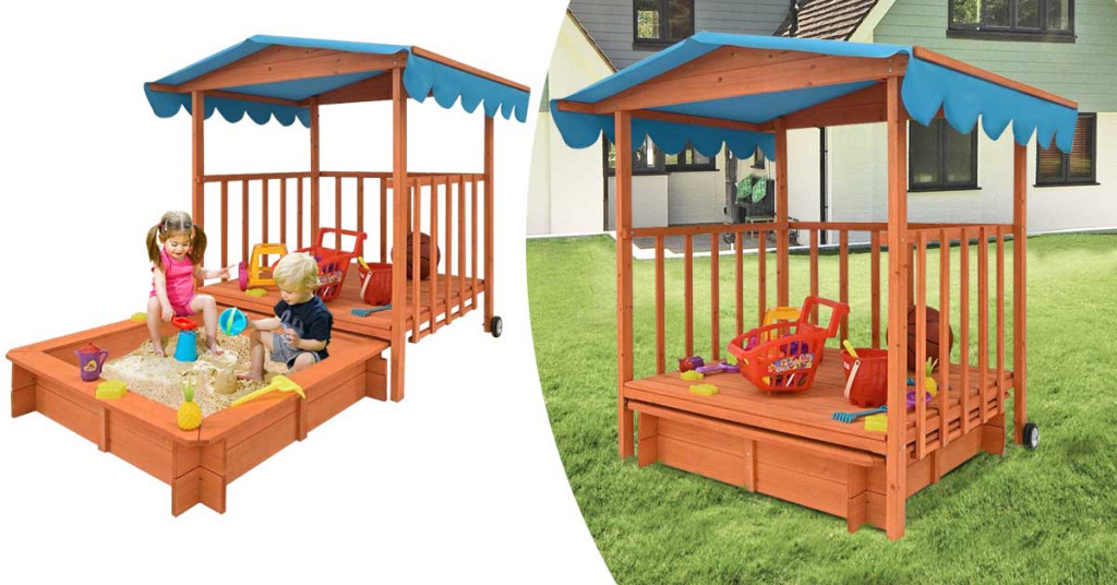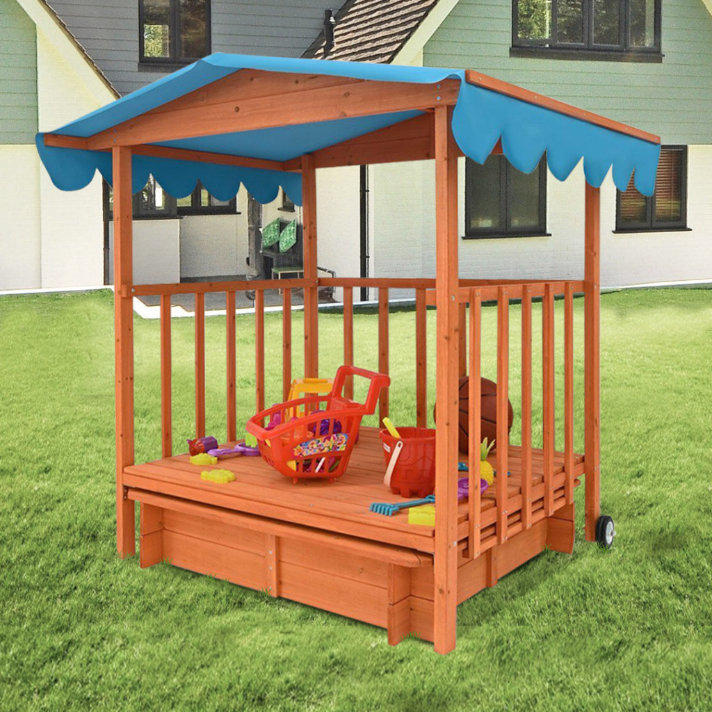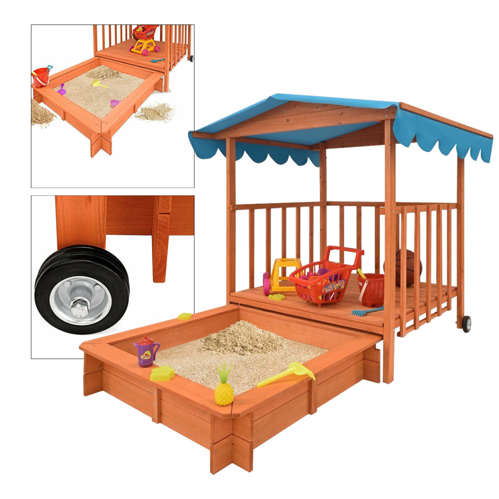 - 1 căsuță din lemn cu ladă de nisip extensibilă și copertină colorată