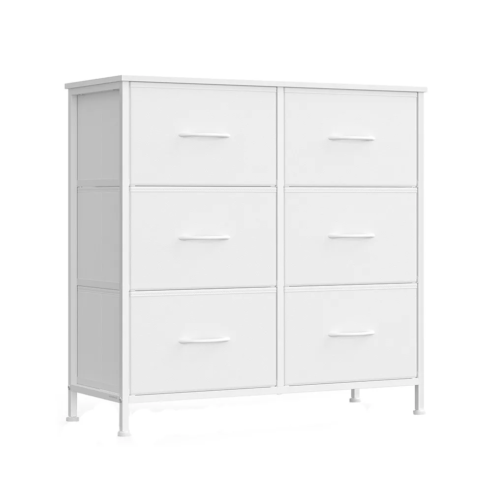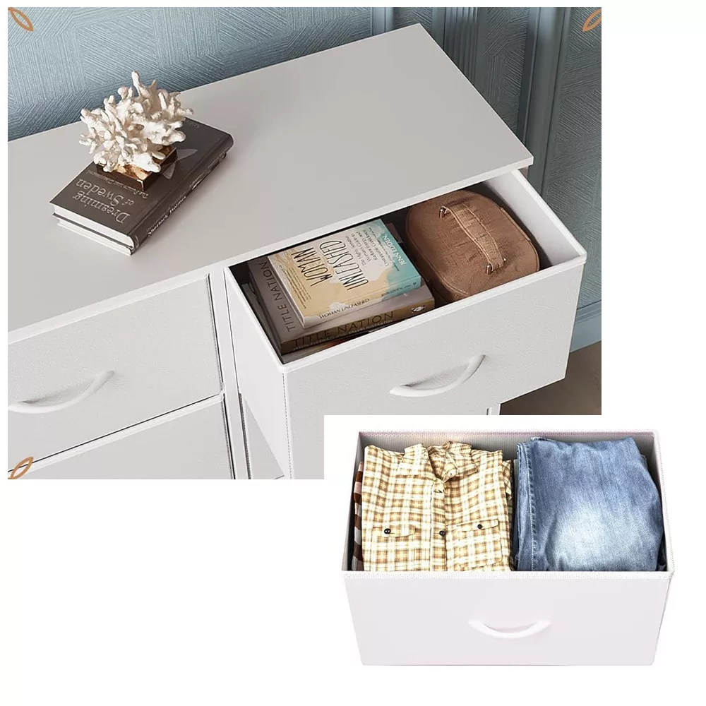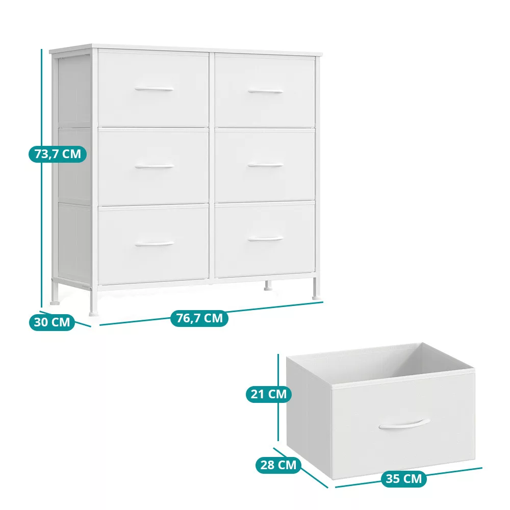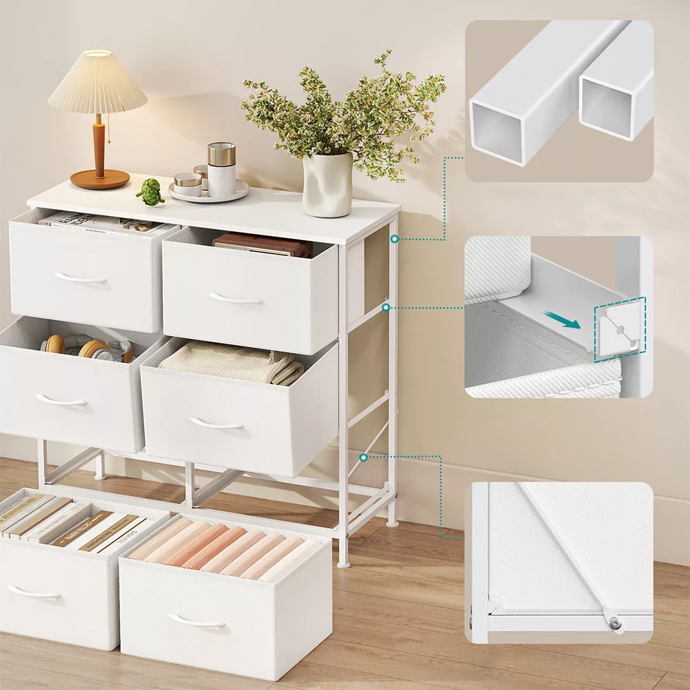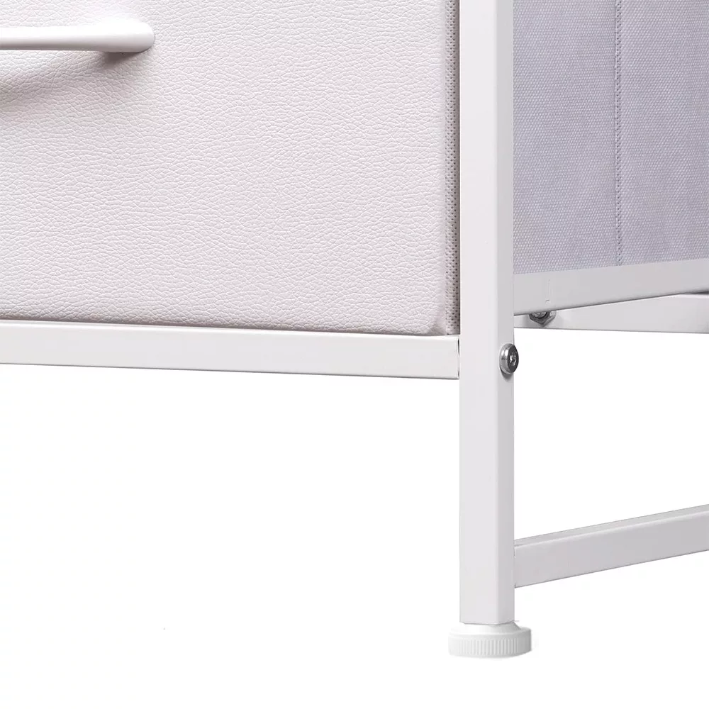 Culoarea albă curată și forma minimalistă se integrează ușor în diverse stiluri de design interior. Sertarele din material textil adaugă o ușurință mobilierului, asigurând în același timp o utilizare practică.