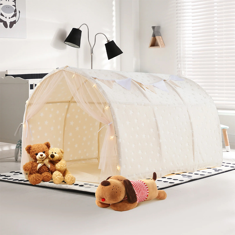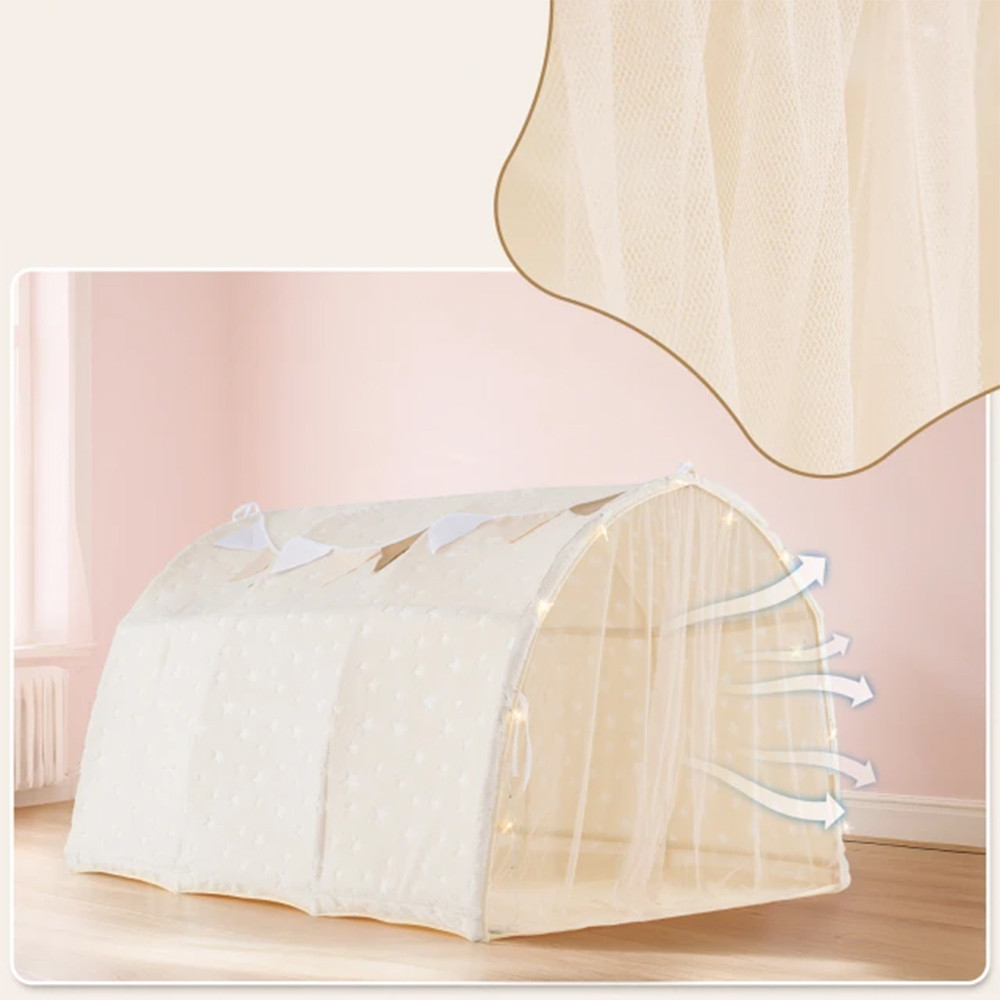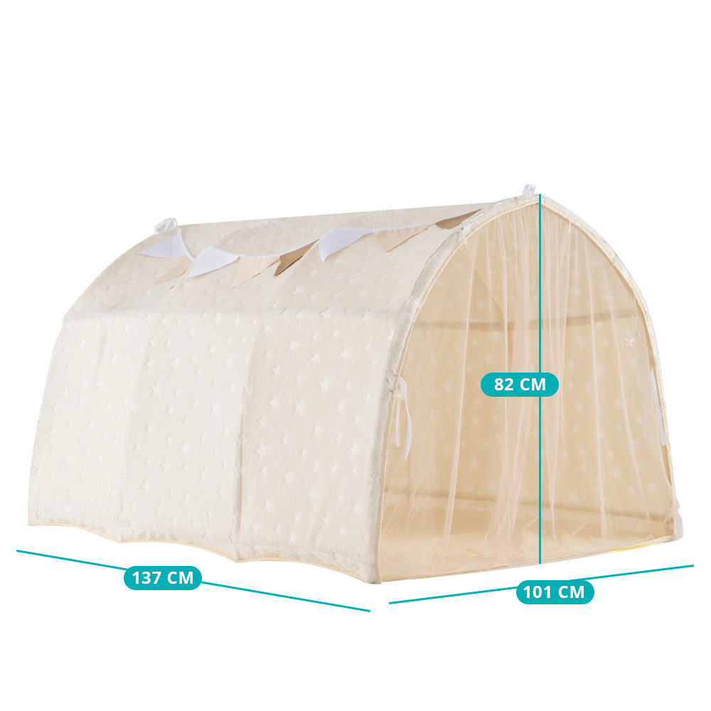 Iluminatul cu sârme în formă de stele și ghirlanda decorativă cu steaguri conferă cortului o atmosferă de basm. Culoarea bej și texturile moi se integrează armonios în majoritatea camerelor de copii, atrăgând imediat atenția.