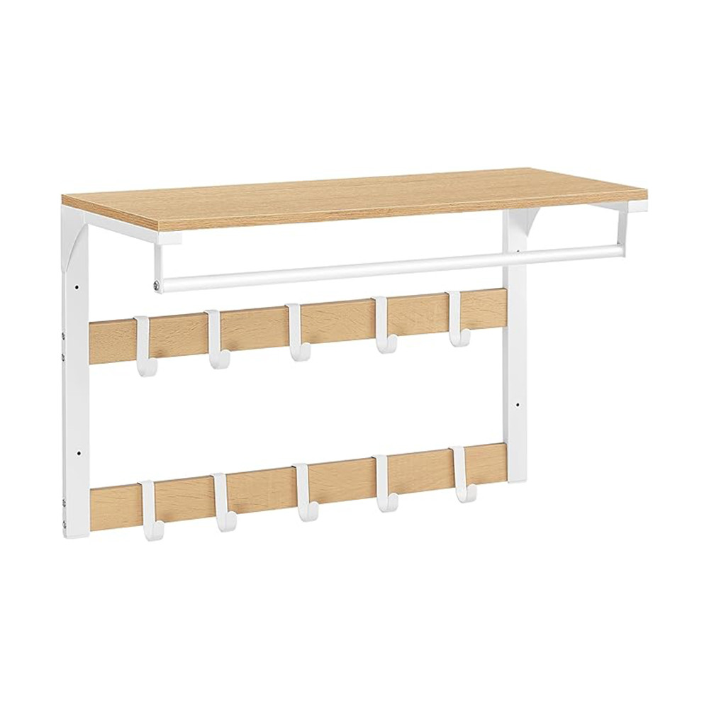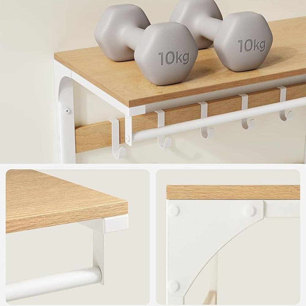 Combinația dintre placa pe bază de lemn și cadrul metalic asigură o capacitate de încărcare fiabilă atât pentru poliță, cât și pentru cârlige și bara de haine.