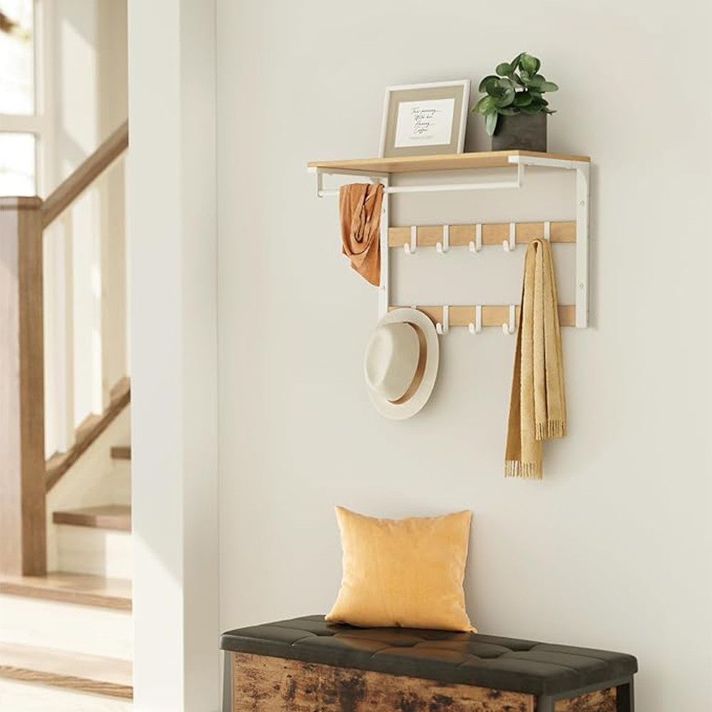Cuierul de perete cu poliță este alegerea ideală dacă dorești să creezi un sistem de depozitare clar și practic pe o suprafață redusă. Cuierul combinat cu poliță permite organizarea hainelor, genților și accesoriilor într-un mod ordonat, iar designul său minimalist se integrează ușor în diferite spații de locuit.