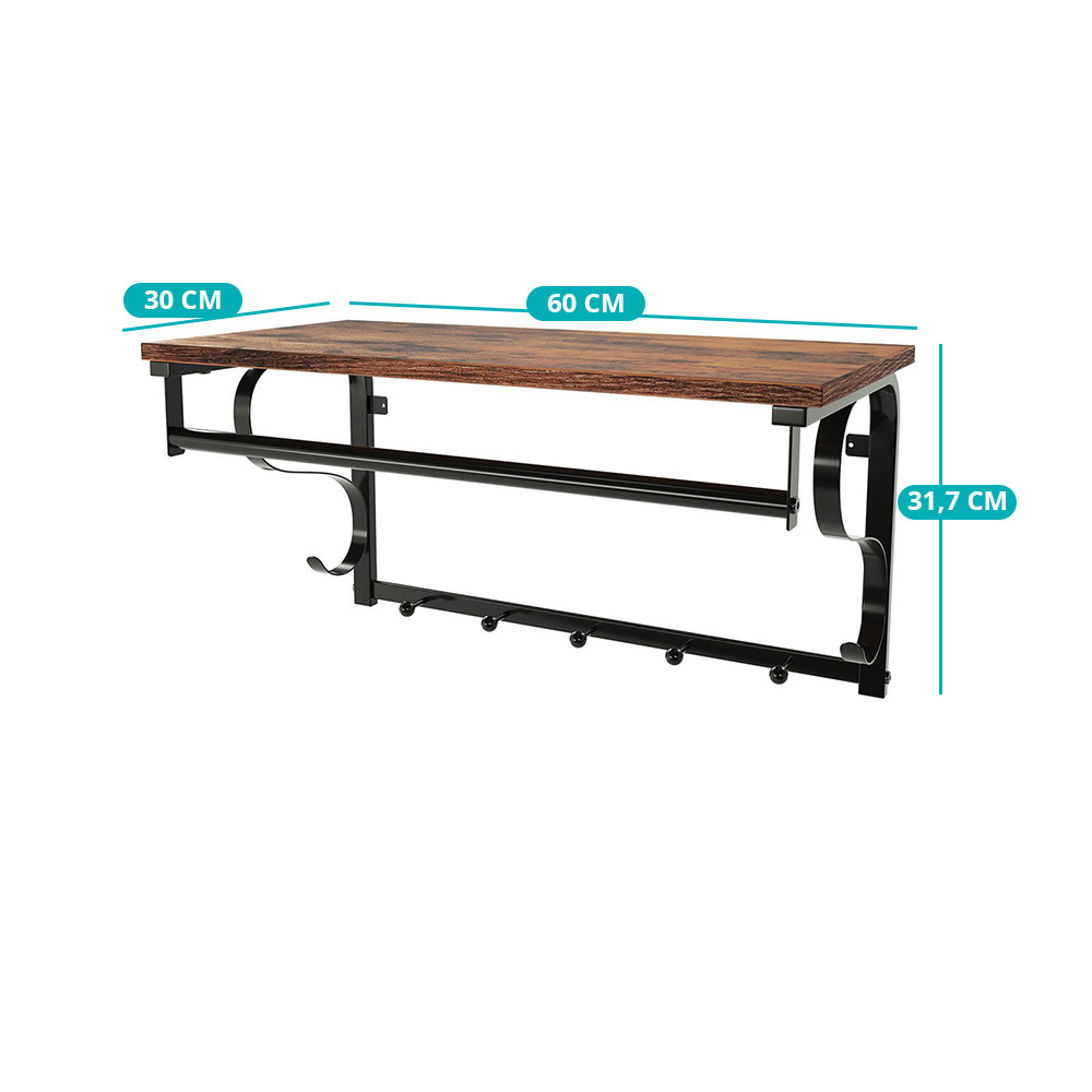 Cuierul de perete cu aspect rustic și design practic ajută la organizarea paltoanelor, genților și accesoriilor. Cuierul rustic dotat cu poliță, cârlige și bară de agățare este ideal pentru hol, coridor sau living, oferind spațiu maxim de depozitare chiar și în încăperi mici, într-un stil industrial modern.