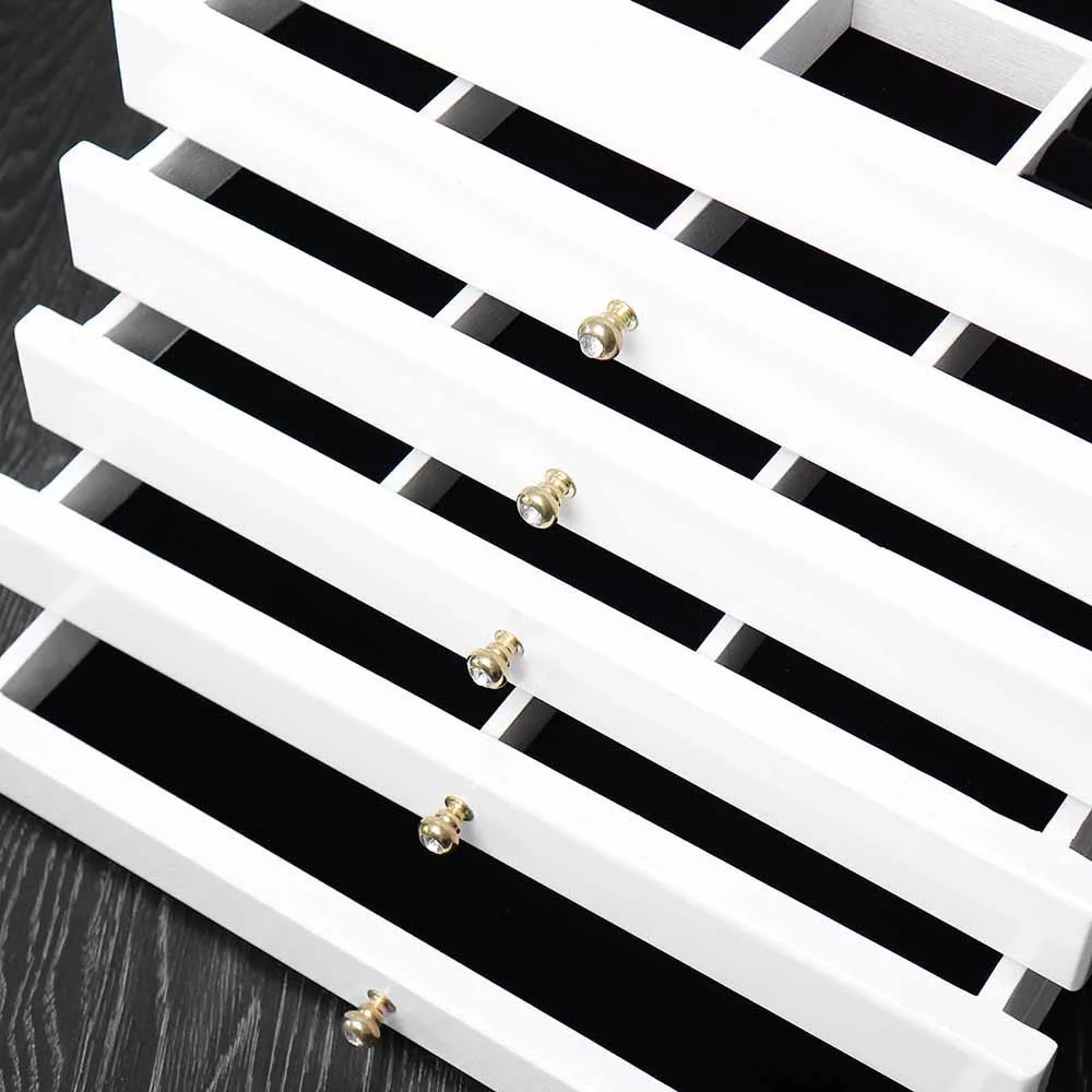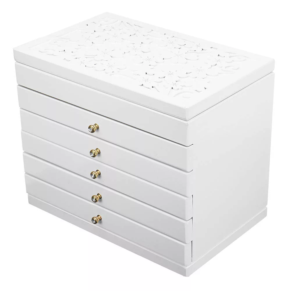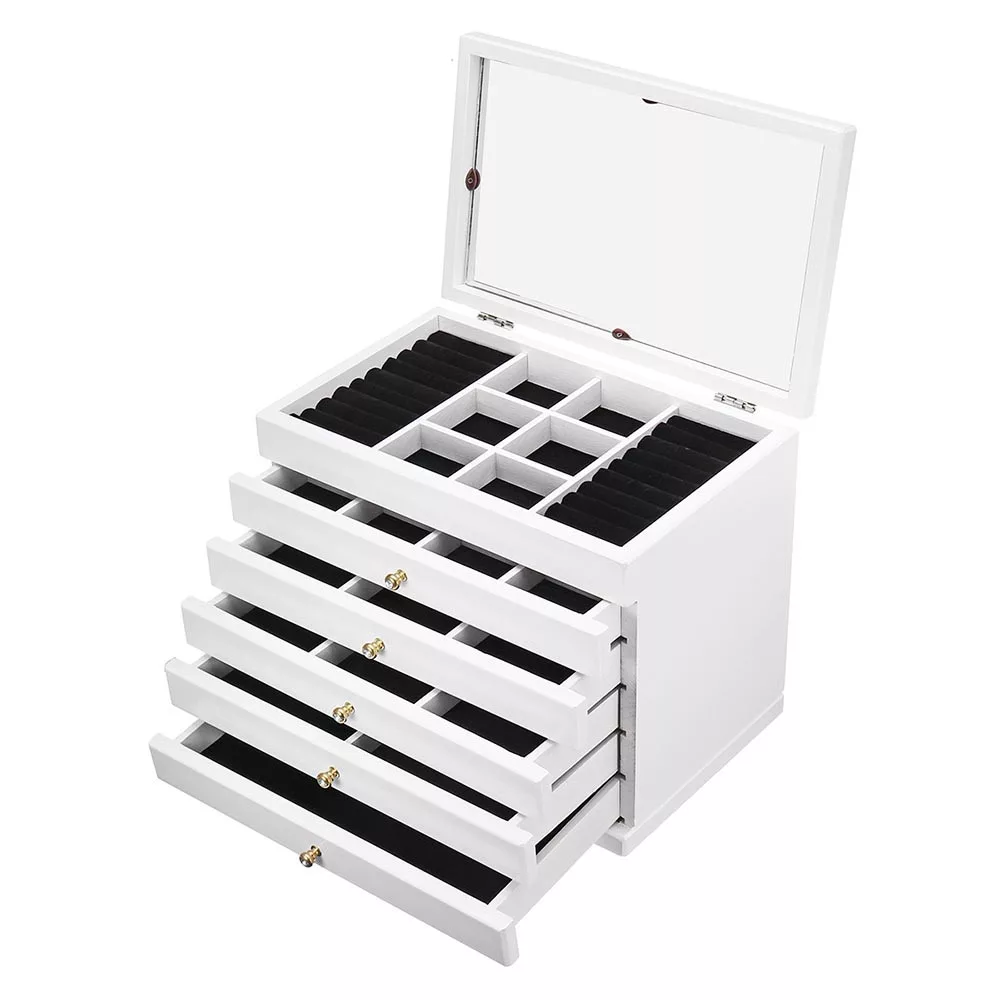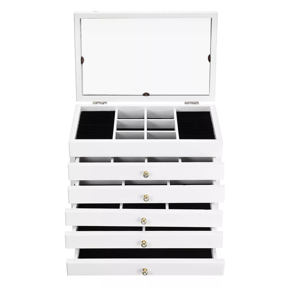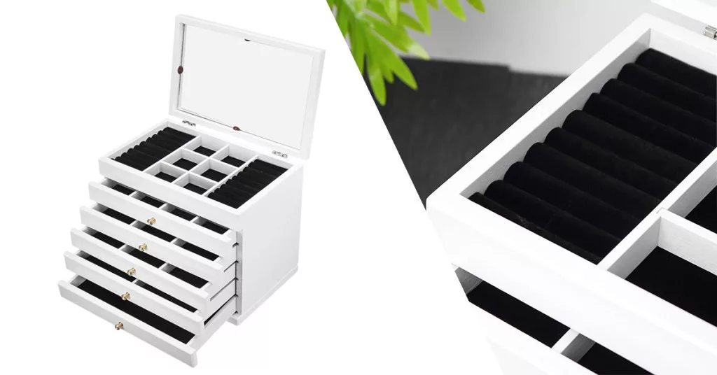 Acest organizator de bijuterii cu 6 compartimente este alegerea ideală pentru cei care doresc să își păstreze accesoriile în ordine. Cele cinci sertare glisante și compartimentele individuale asigură un spațiu dedicat fiecărei bijuterii. Rolele speciale pentru inele previn zgârieturile, astfel încât chiar și piesele mai delicate rămân protejate.