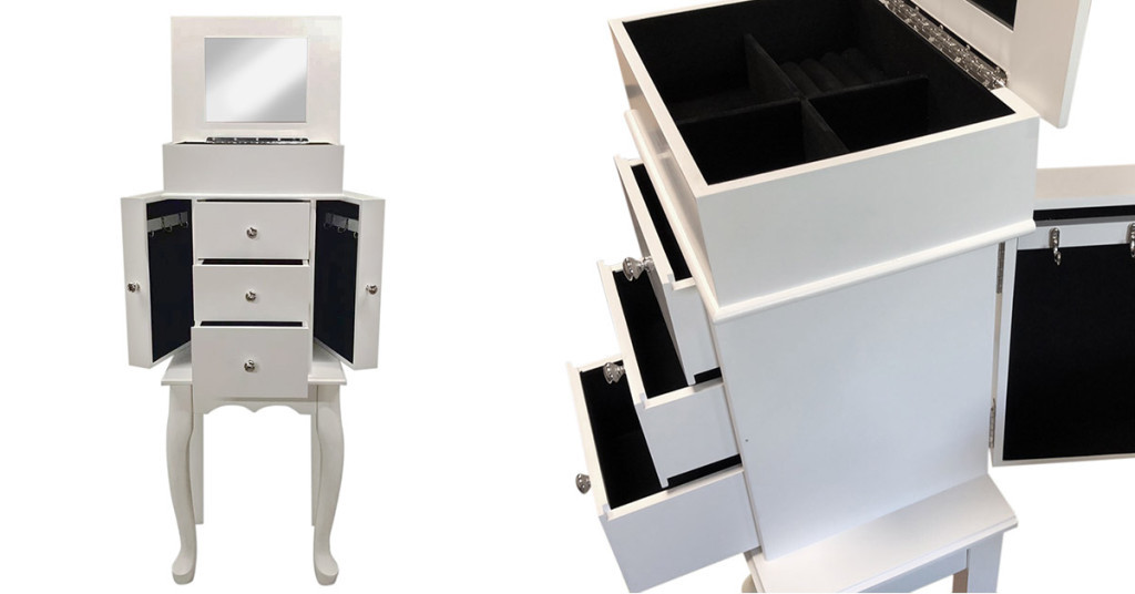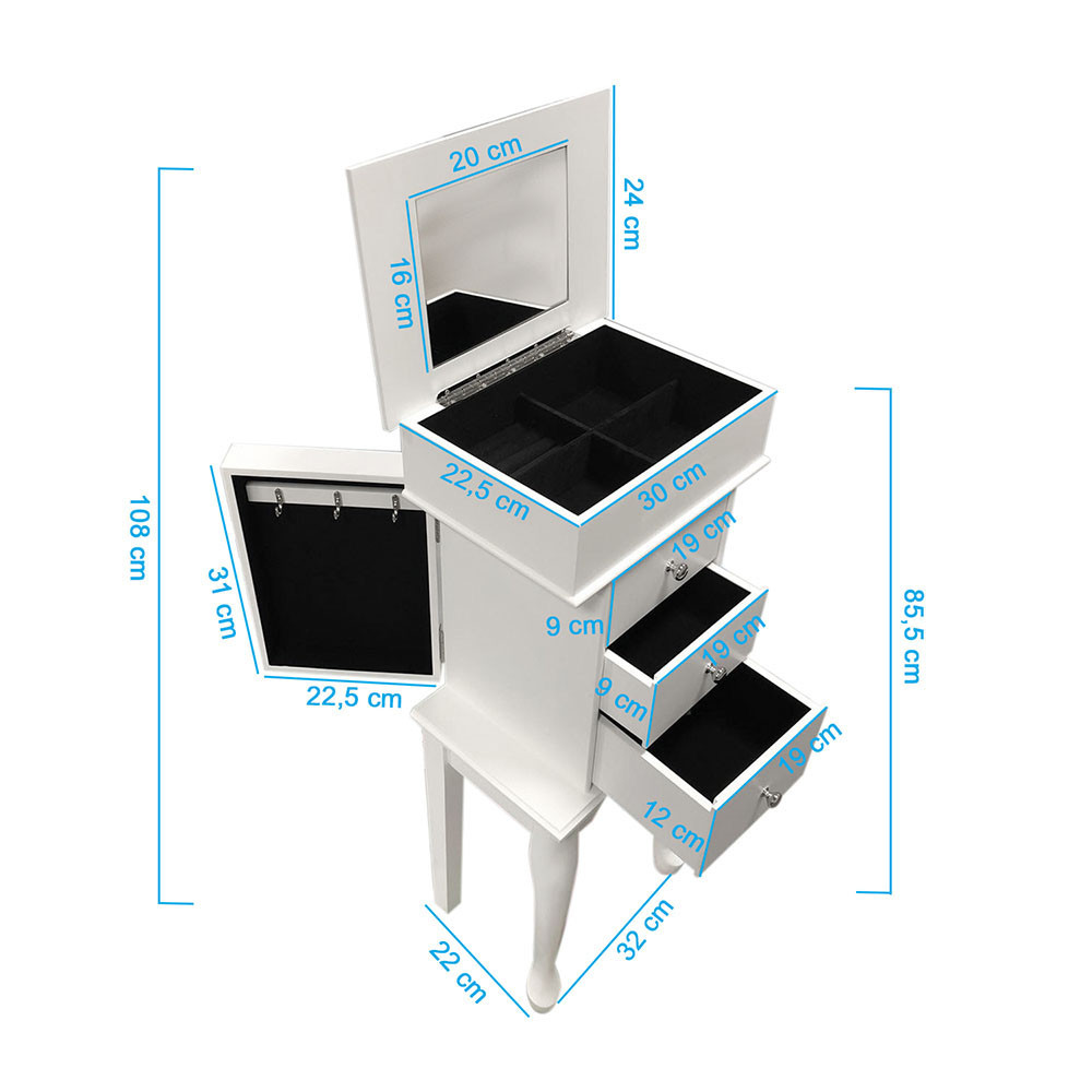 Dulapul este proiectat pentru a păstra bijuteriile într-un mod ordonat. Cele trei sertare, cele două compartimente laterale și spațiul superior cu oglindă oferă loc special pentru coliere, inele, brățări și alte accesorii.