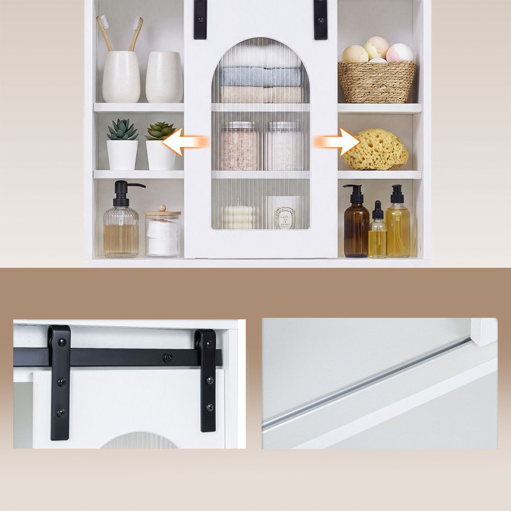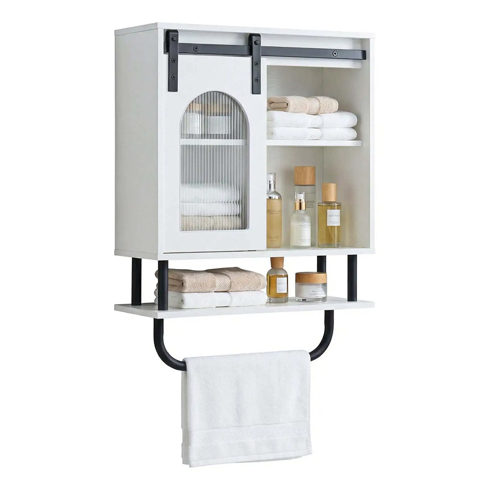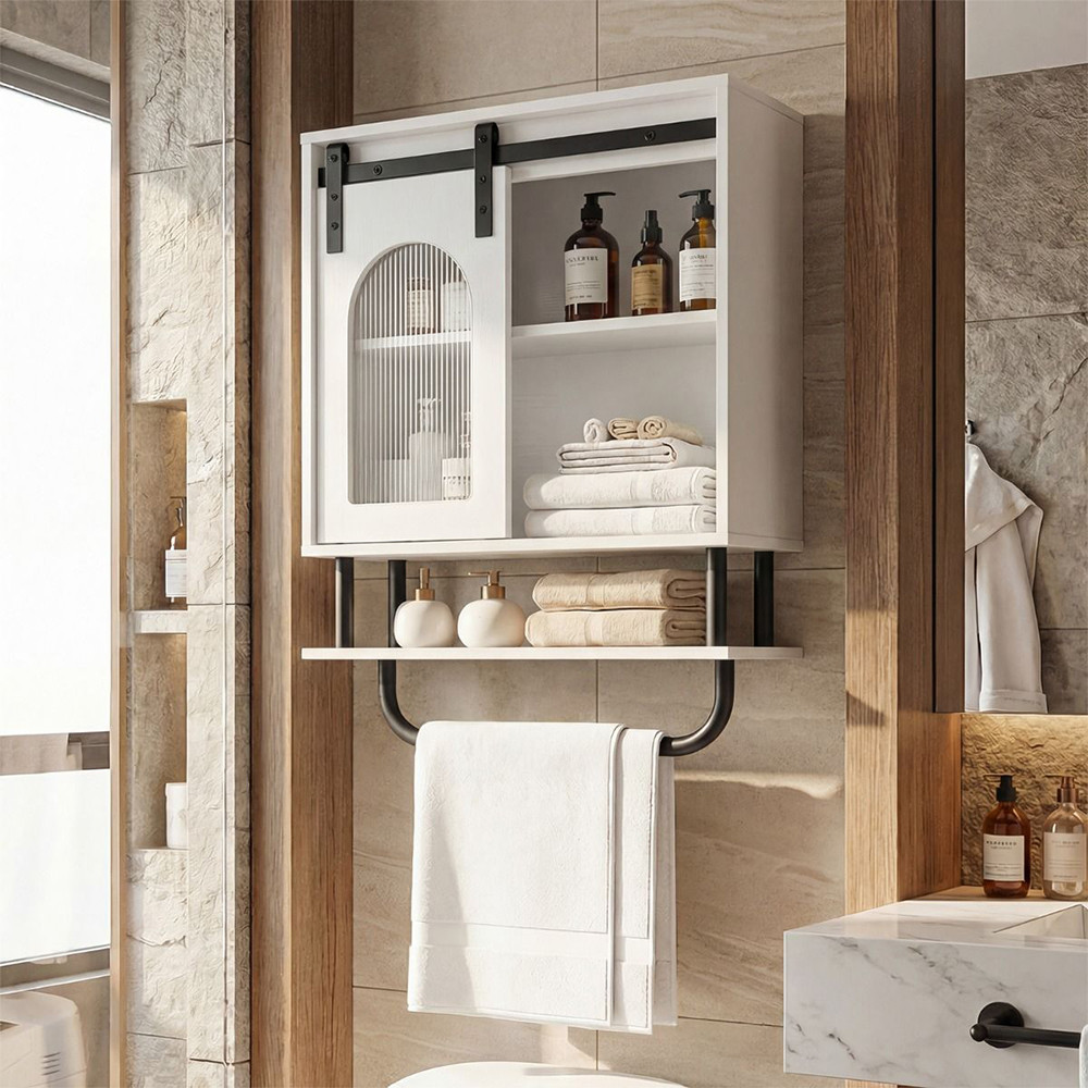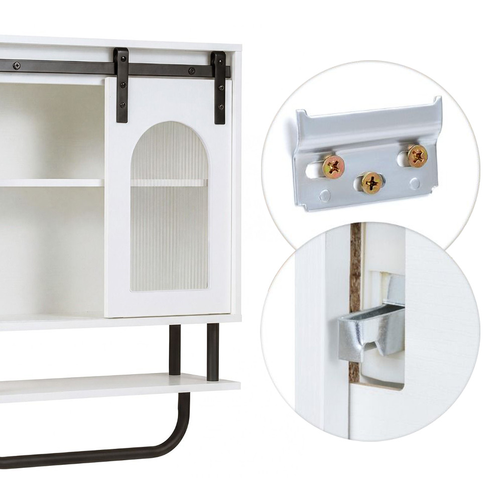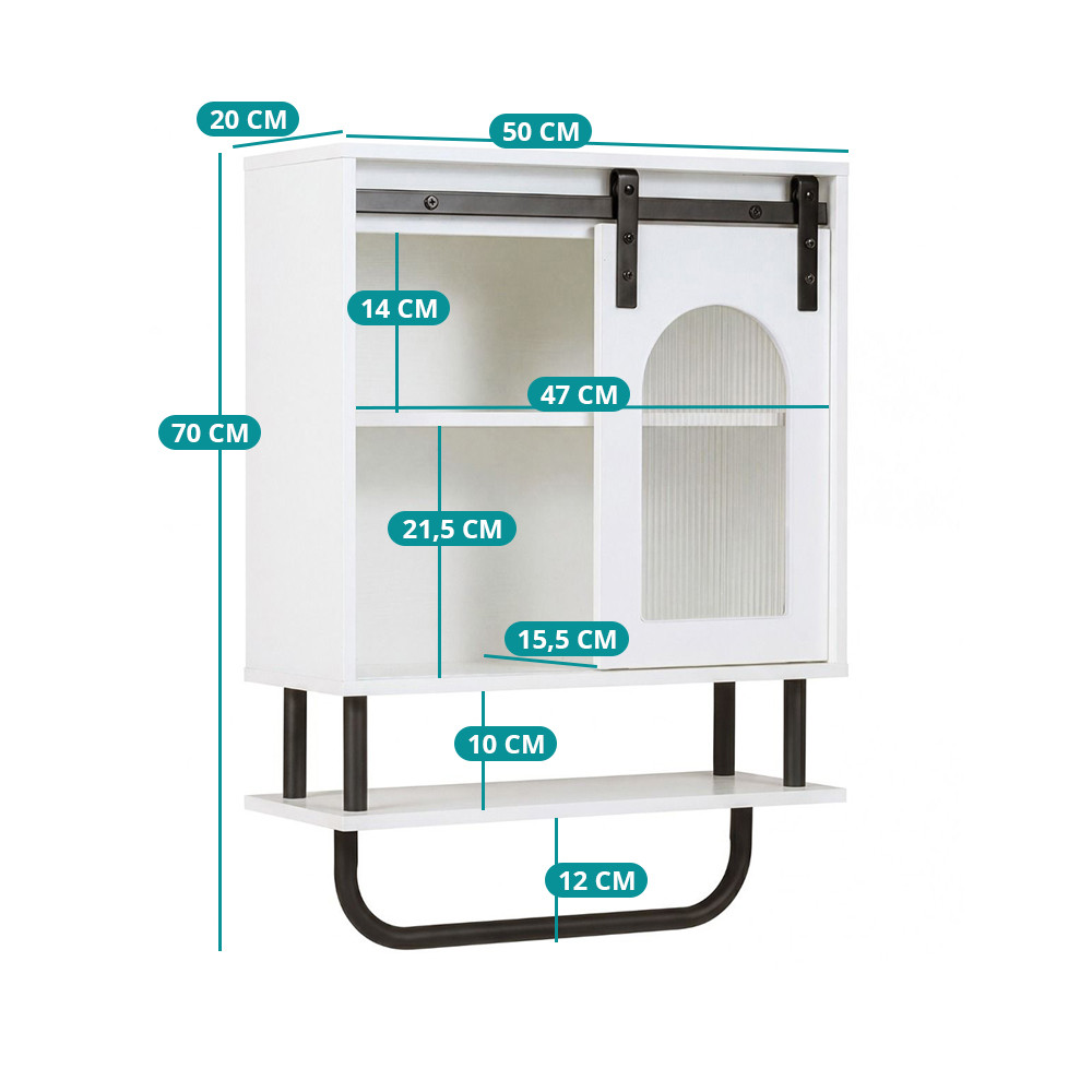 Ușile glisante se mișcă lateral, nu se deschid spre exterior, deci sunt confortabile de folosit și în băi mici. Suportul pentru prosoape de jos este ideal pentru prosoape de mâini, prosoape de bucătărie sau pentru organizatoare cu agățat.