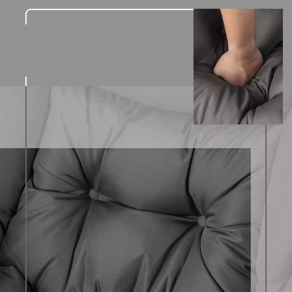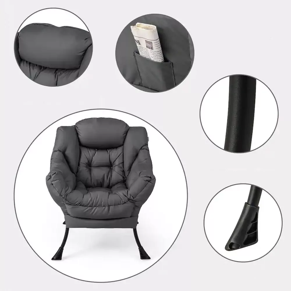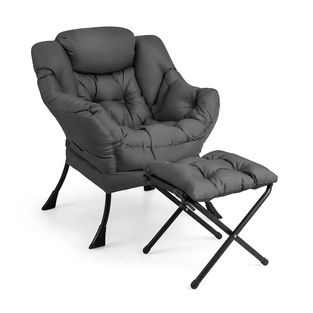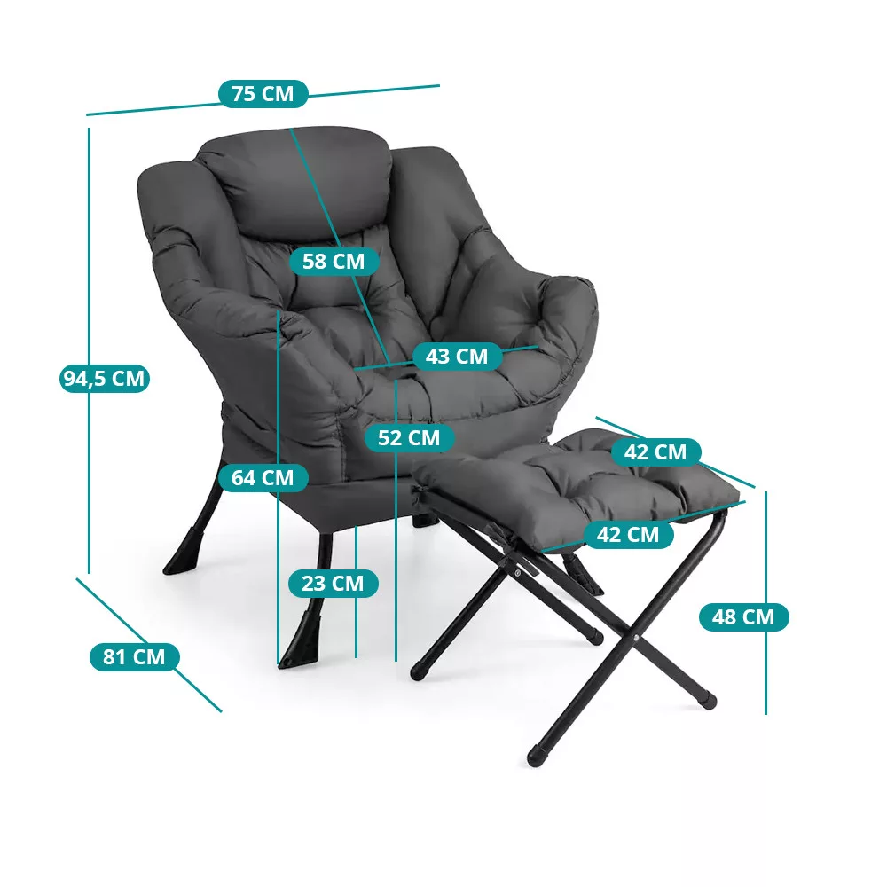 Captuselă groasă înconjoară plăcut, astfel încât să rămâi confortabil chiar și după perioade lungi de șezut. Fotoliul și suportul pentru picioare sunt concepute pentru a oferi suport real, nu doar pentru a sta pe ele. Suportul poate fi folosit și ca un loc suplimentar dacă ai oaspeți.
