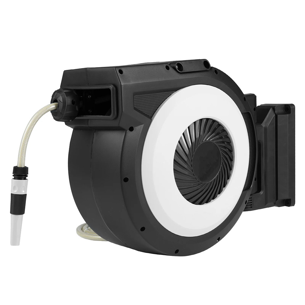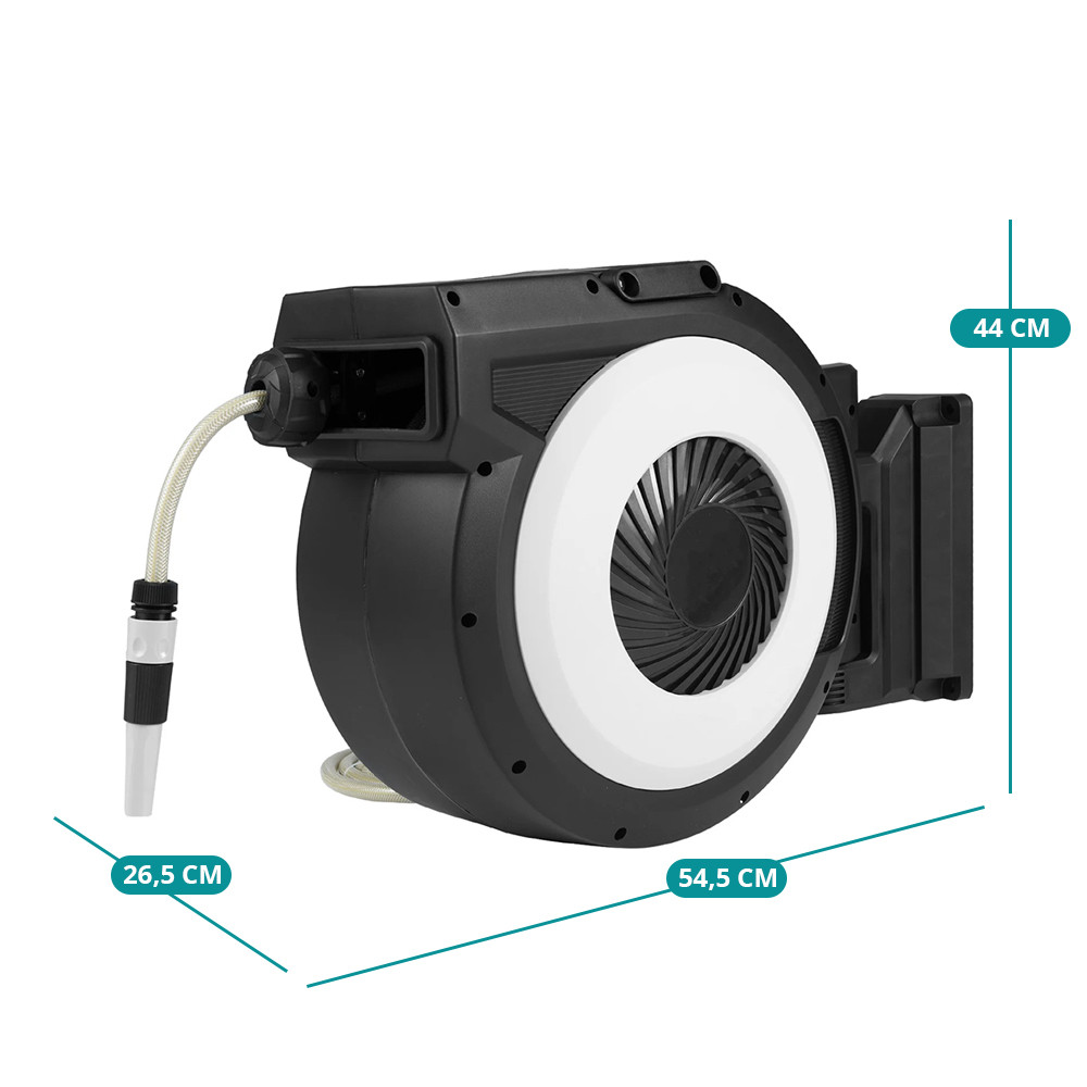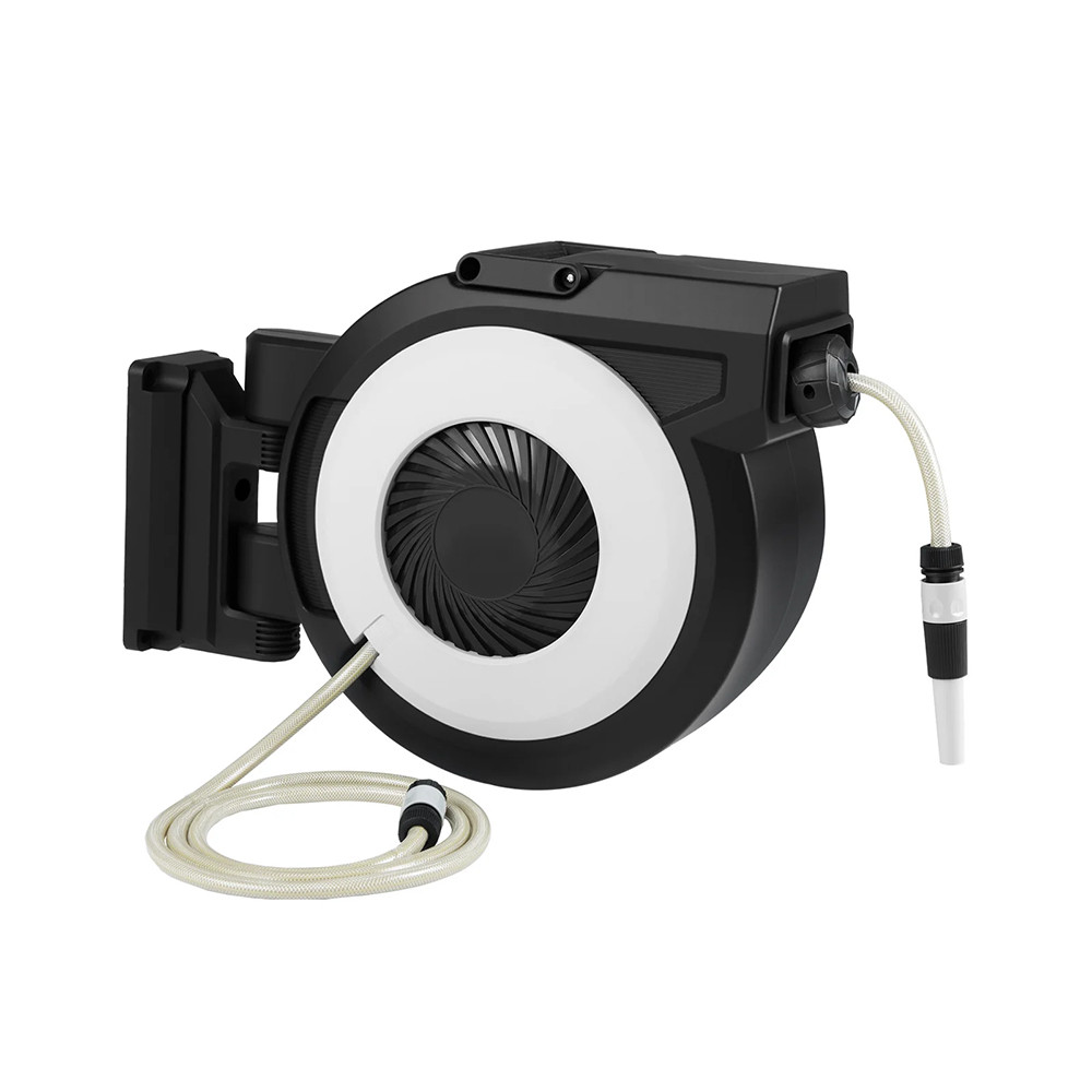 Carcasa închisă protejează furtunul în timpul utilizării zilnice și oferă un aspect ordonat lângă grădină sau garaj. Învelișul negru este discret, nu atrage atenția dar conferă o impresie solidă, iar furtunul nu atârnă liber.
