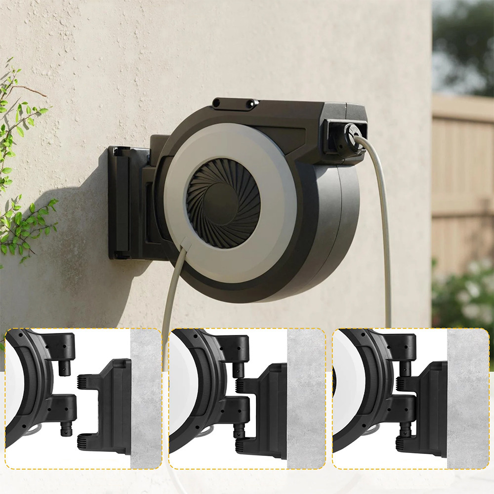 Suportul pe perete se poate roti, facilitând direcționarea furtunului acolo unde lucrezi. Cu mânerul încorporat, cutia poate fi ținută și în mână dacă e nevoie să o muți temporar. Ideal pentru udat, curățat curtea, spălat mașina sau clătit câinele.
