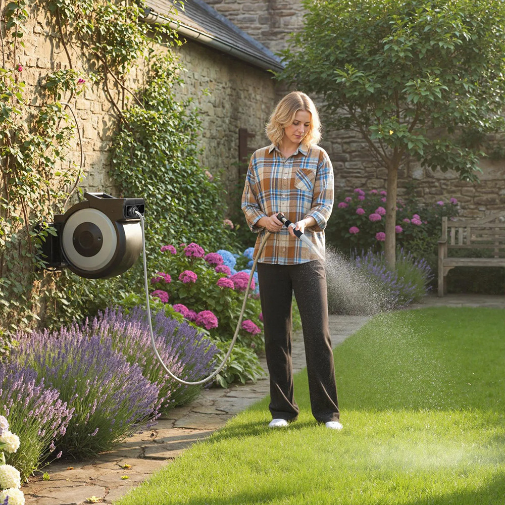 Dacă udăți în mai multe locuri în grădină, e bine să ai furtunul mereu la îndemână, fără să stea împrăștiat. Scoți lungimea necesară, ajungi la flori, pe terasă sau chiar la mașină, fără să te încurci în noduri.