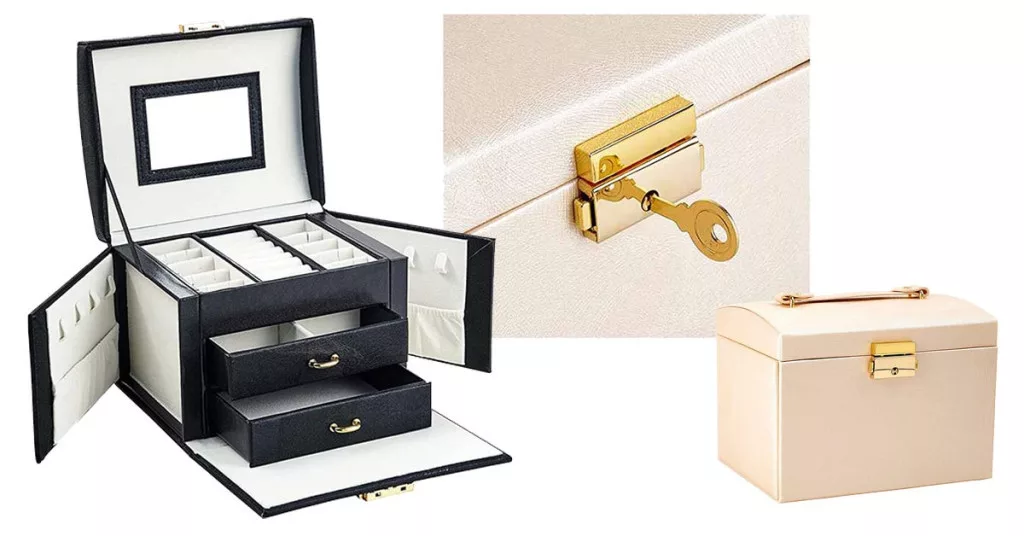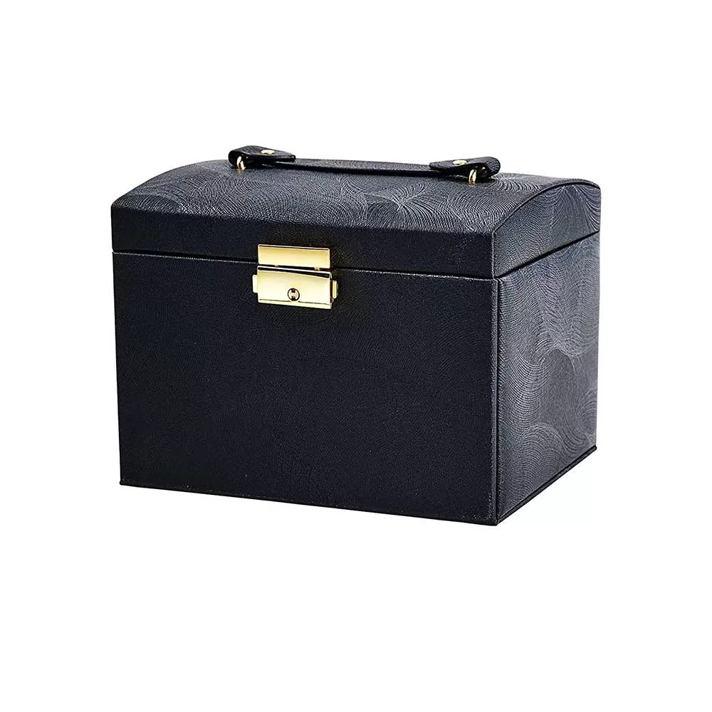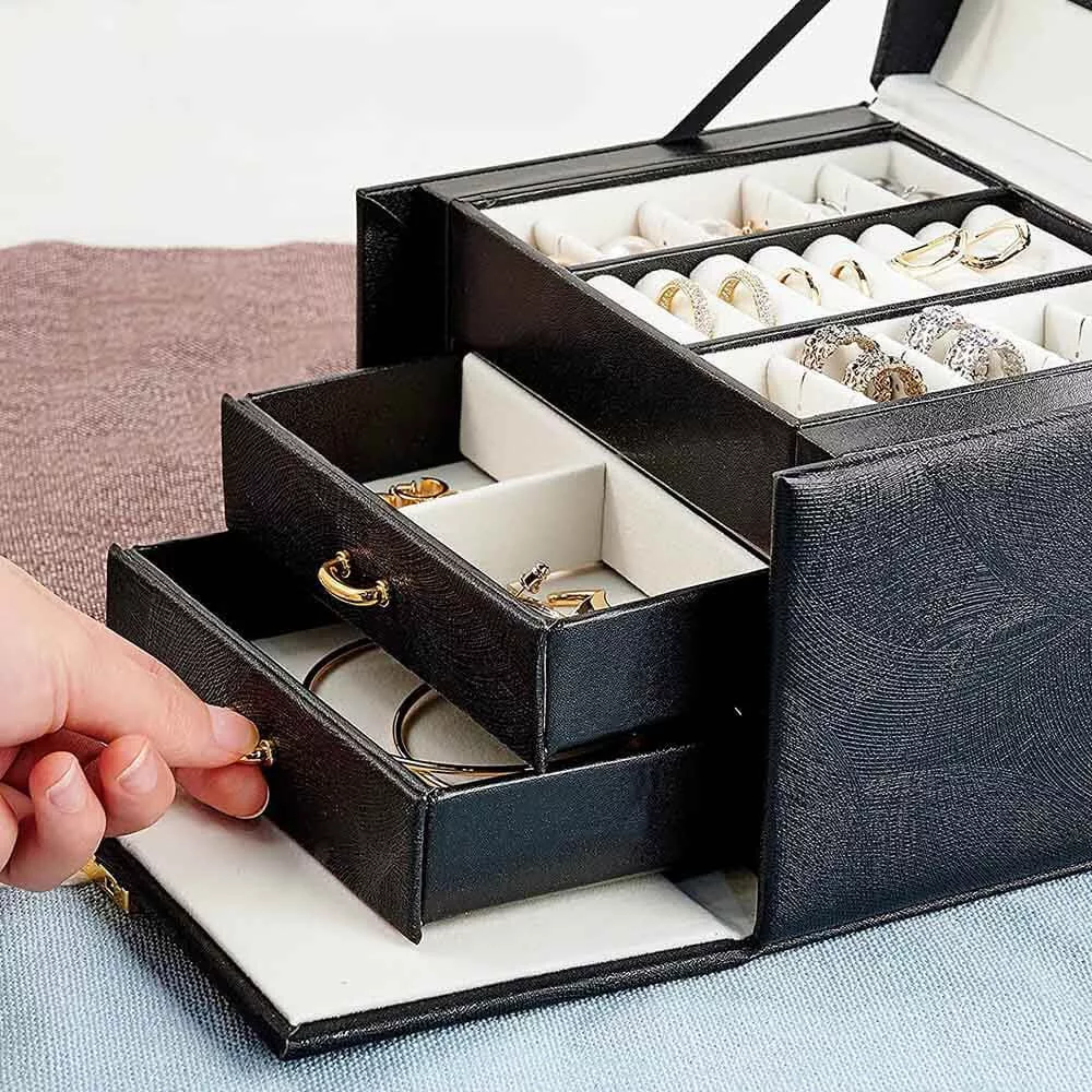 Păstrează-ți bijuteriile organizate și protejate cu o geantă de bijuterii sofisticată și funcțională! Închisă, arată ca o cutie elegantă, iar odată deschisă, oferă numeroase compartimente, sertare și suporturi pentru inele, astfel încât toate accesoriile tale preferate să fie la îndemână. Oglinda integrată îți permite să încerci rapid bijuteriile oriunde te-ai afla.