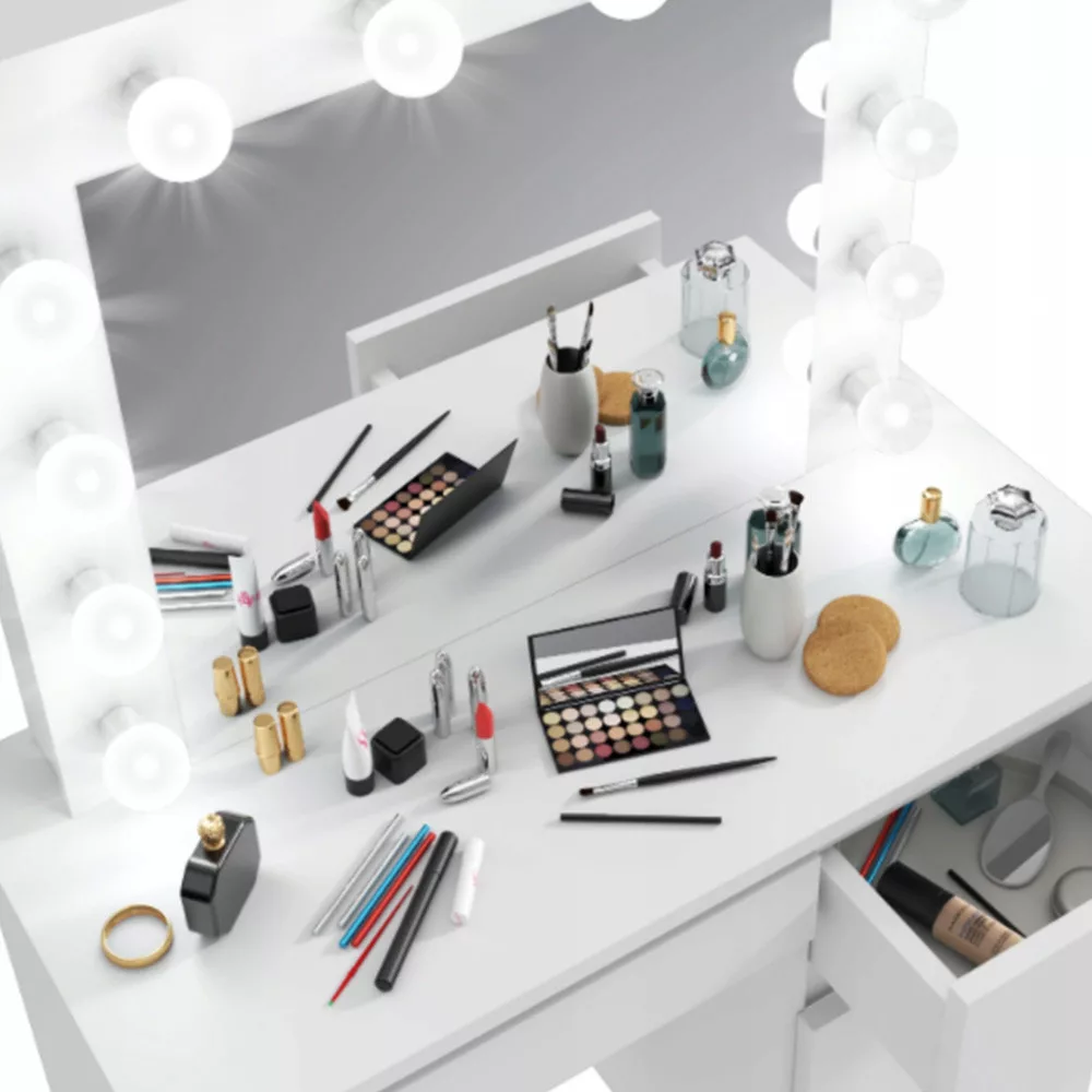 Cele patru sertare spațioase pot acomoda cu ușurință machiajul, bijuteriile și uneltele de coafare, asigurându-se că totul este la îndemână atunci când ai nevoie. Designul elegant și rafinat se integrează perfect în orice interior.