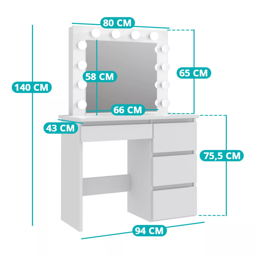 Masa de 94 cm lățime oferă un spațiu de lucru adecvat, în timp ce înălțimea totală de 140 cm asigură o reflecție confortabilă. Secțiunea oglindită oferă un câmp vizual larg, permițându-ți să acorzi atenție fiecărui detaliu.