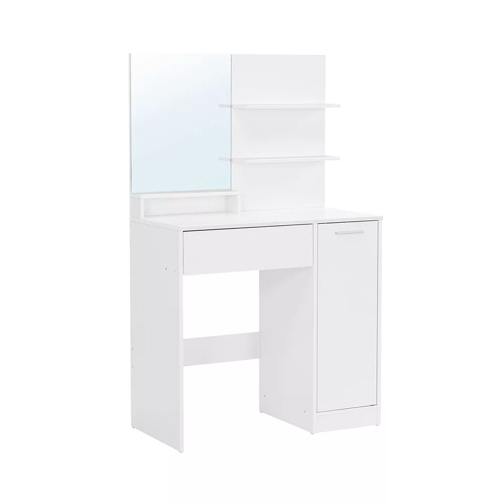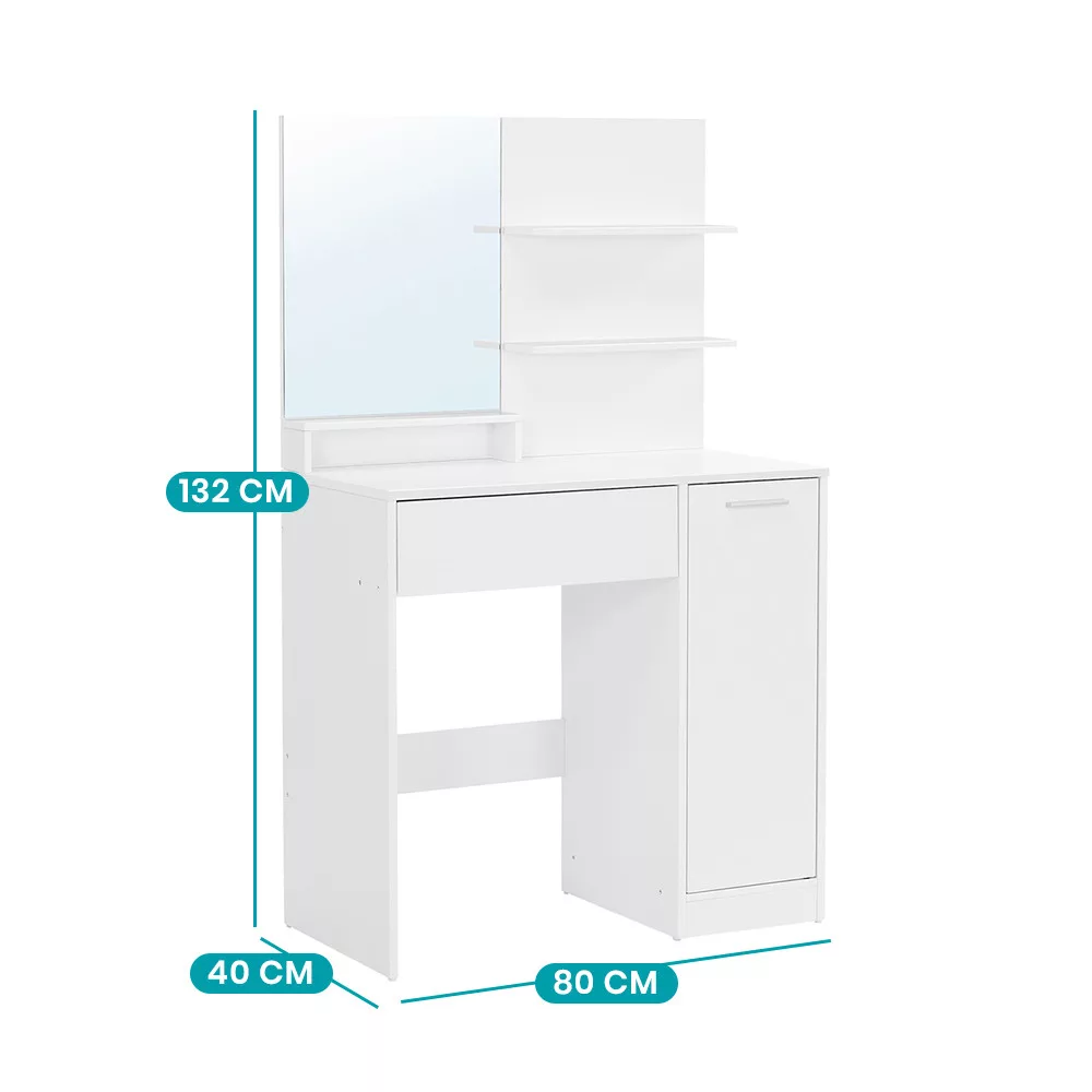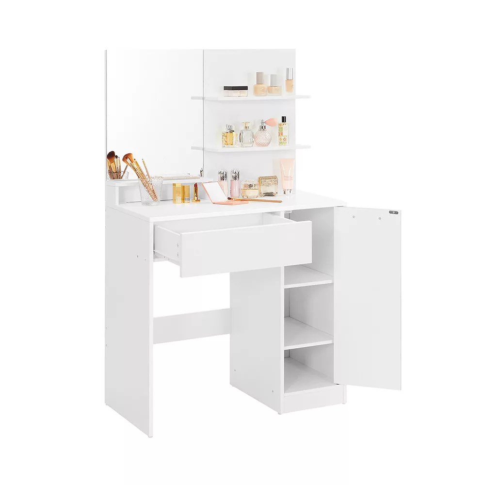 Zonele de stocare spațioase ale mesei asigură că toate produsele tale de machiaj și îngrijire sunt la îndemână. Sertarul este perfect pentru pensule și accesorii mai mici, în timp ce cele două rafturi și dulapul lateral oferă suficient spațiu pentru creme, parfumuri și alte produse.