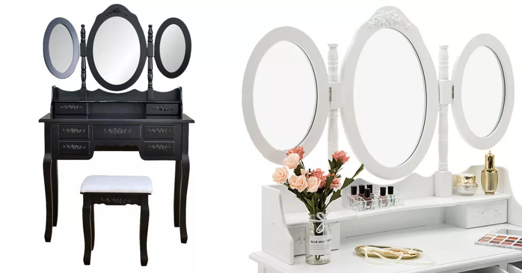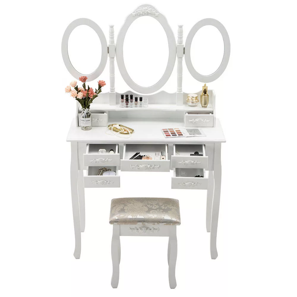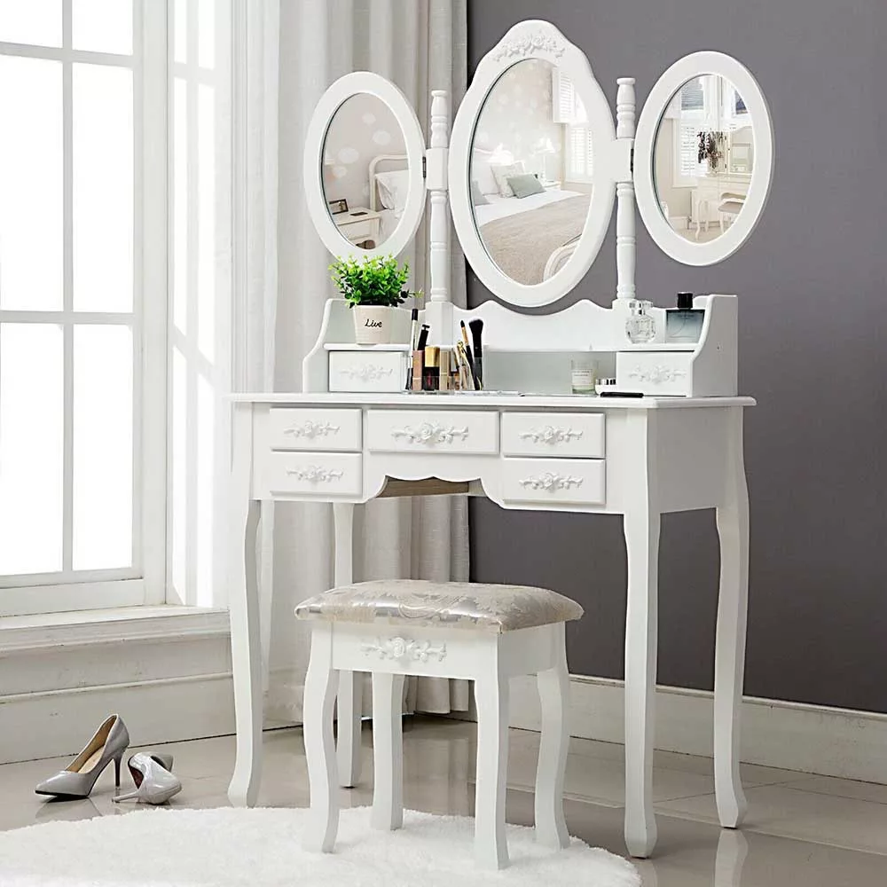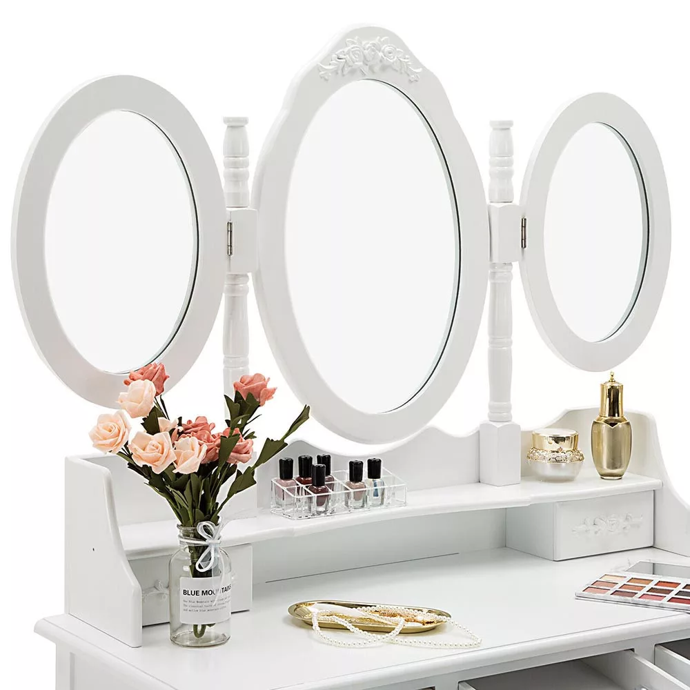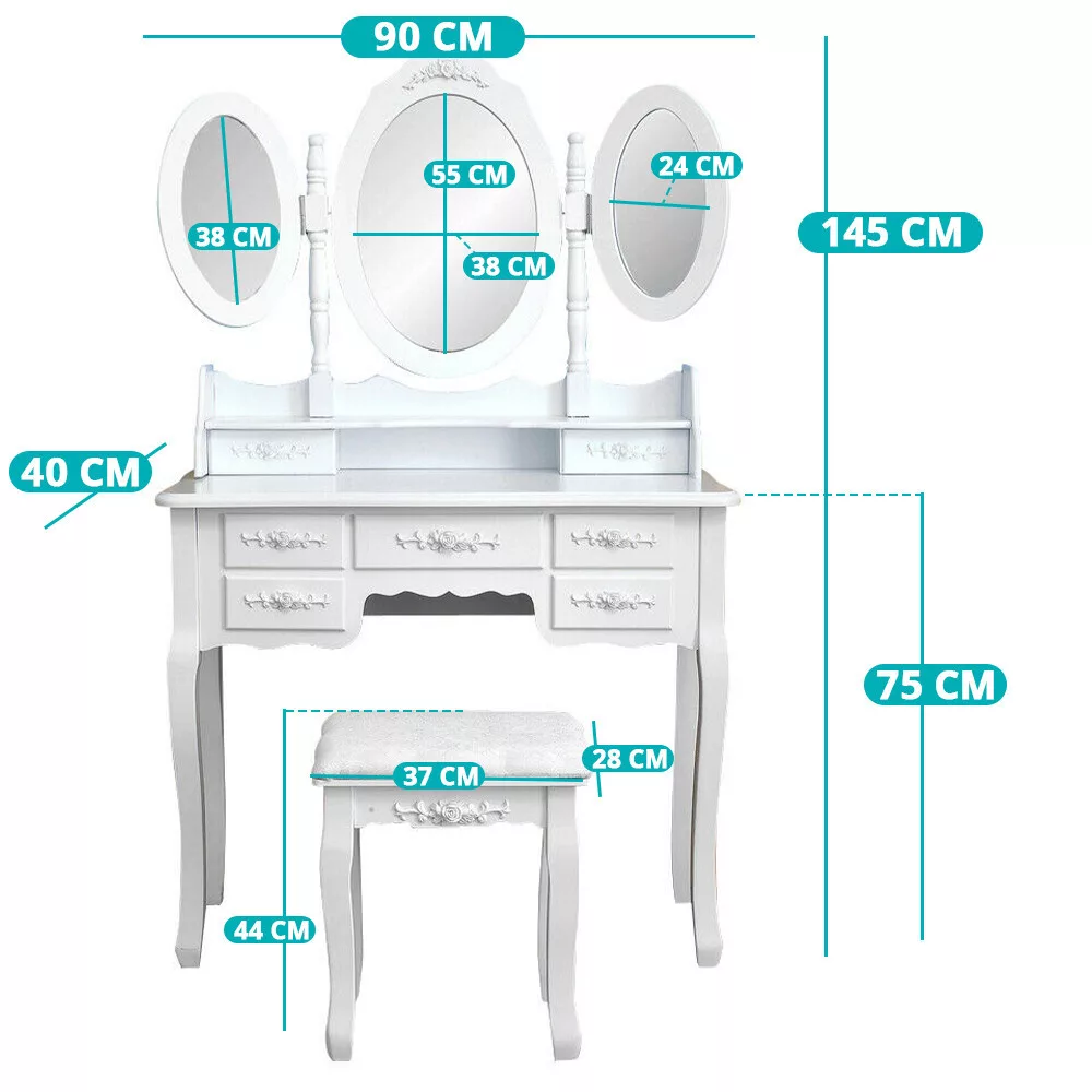 Această masă de toaletă cu oglindă este alegerea perfectă dacă îți dorești eleganță de nivel salon acasă. Decorațiile curbe și liniile curate creează un efect elegant și clasic. Sertarele încorporate permit depozitarea organizată a machiajului, bijuteriilor și altor accesorii. Datorită blatului detașabil, masa poate fi folosită și ca birou – oferind o soluție și mai versatilă pentru utilizarea zilnică.