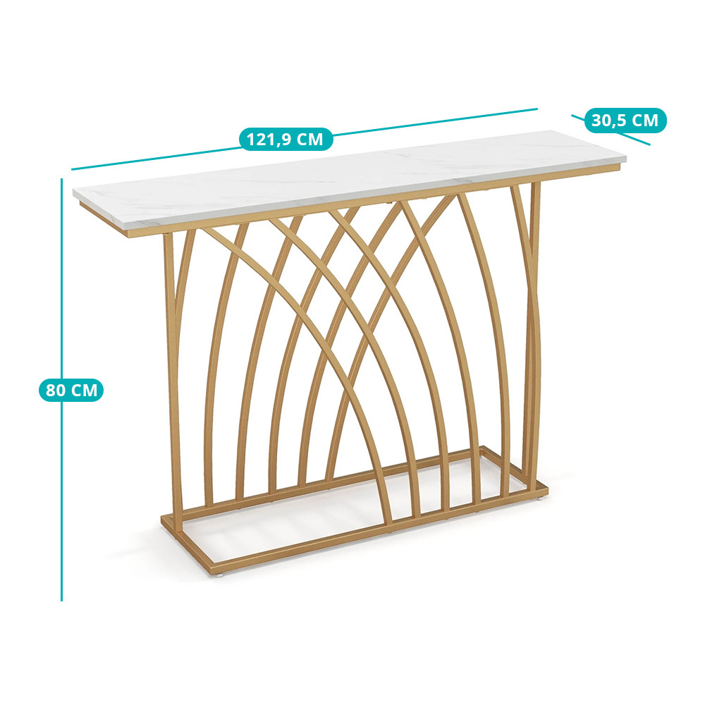 Combinația dintre blatul cu efect de marmură albă și cadrul metalic de culoare aurie conferă un aspect sofisticat spațiului, rămânând în același timp vizual ușor. Este o alegere ideală dacă dorești să îmbunătățești interiorul tău cu o piesă de mobilier distinctivă, dar minimalistă.