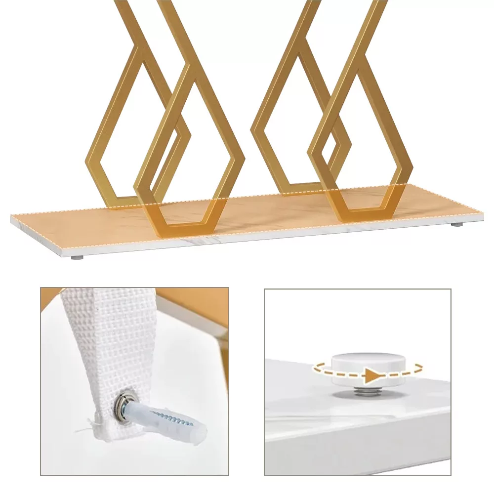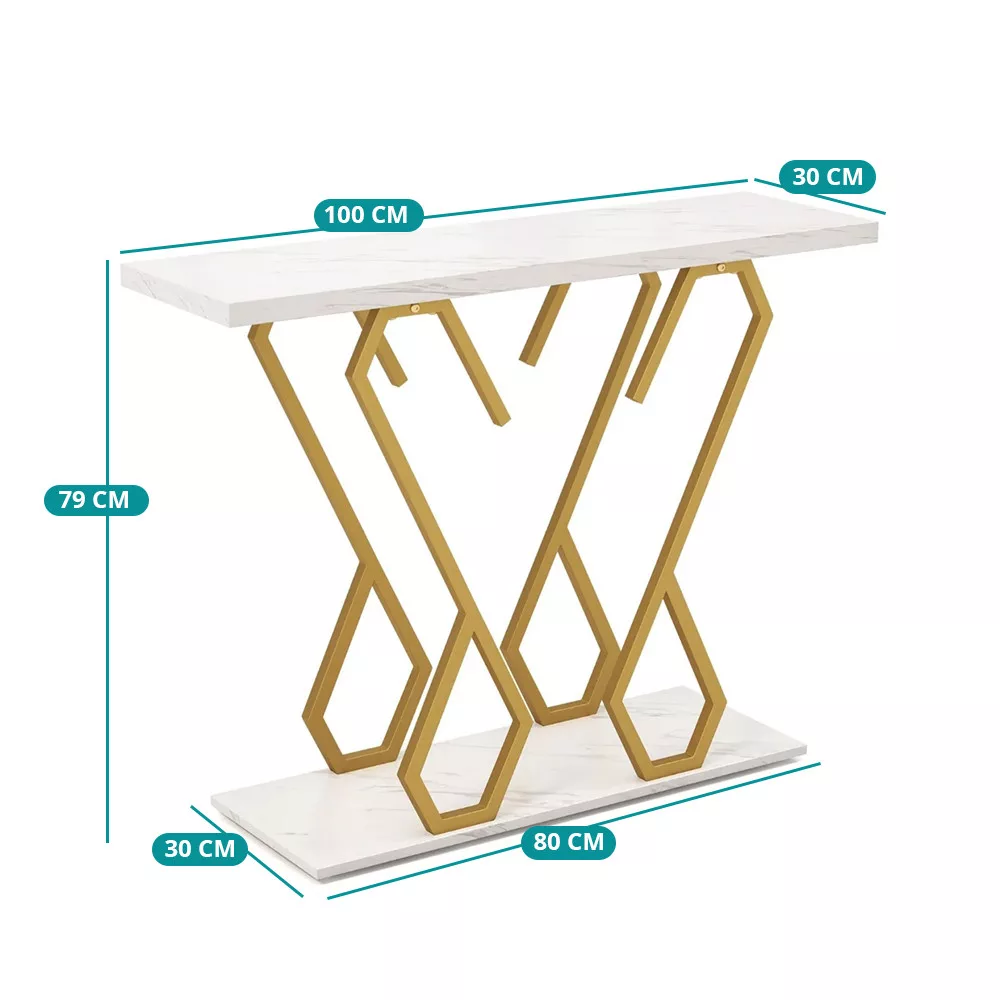 Blatul alb cu efect marmură este elegant, iar picioarele geometrice aurii oferă un caracter modern. Se potrivește frumos în spații moderne, minimaliste sau glam, fiind o piesă decorativă excelentă sub oglindă, pe hol sau în sufragerie.