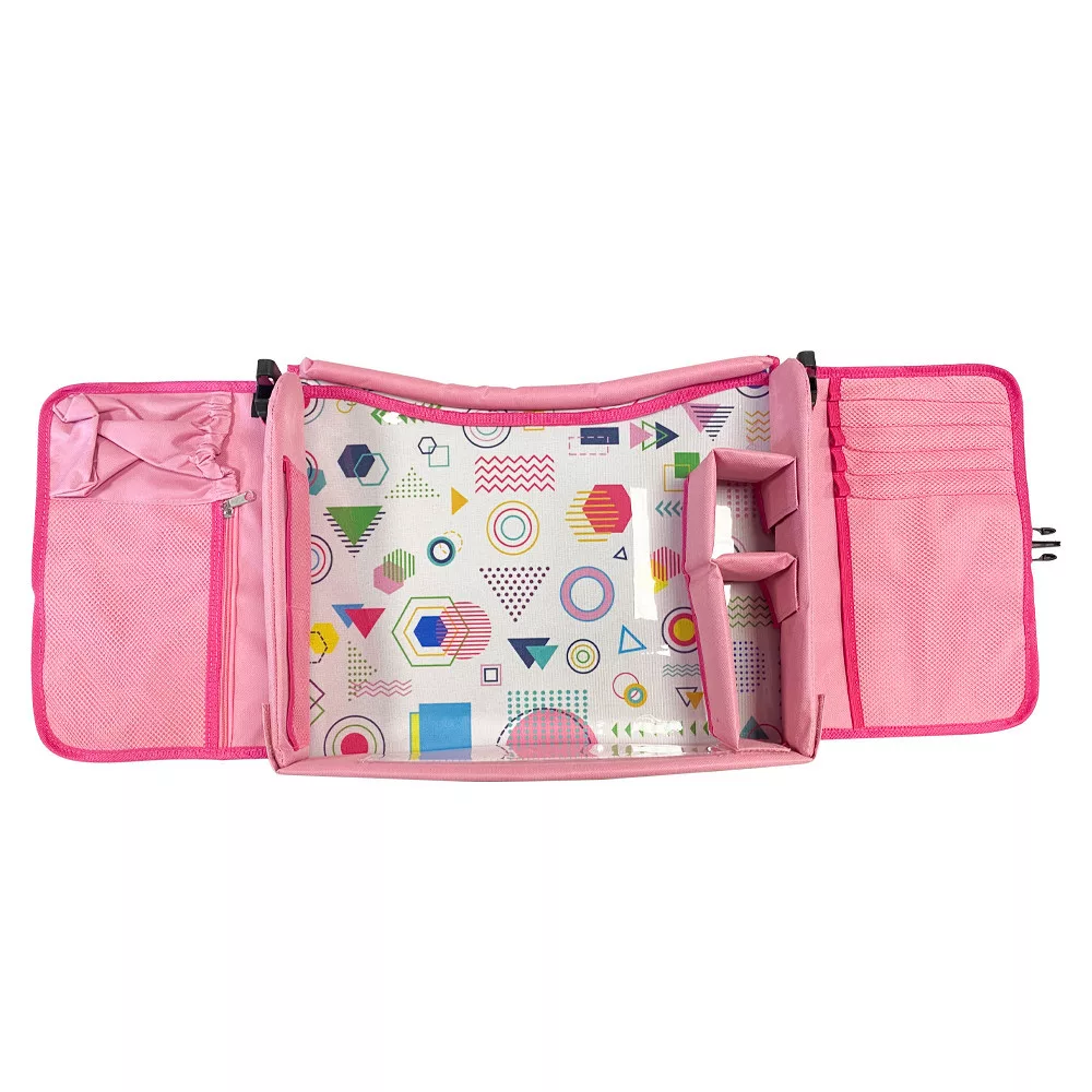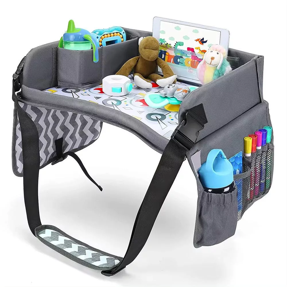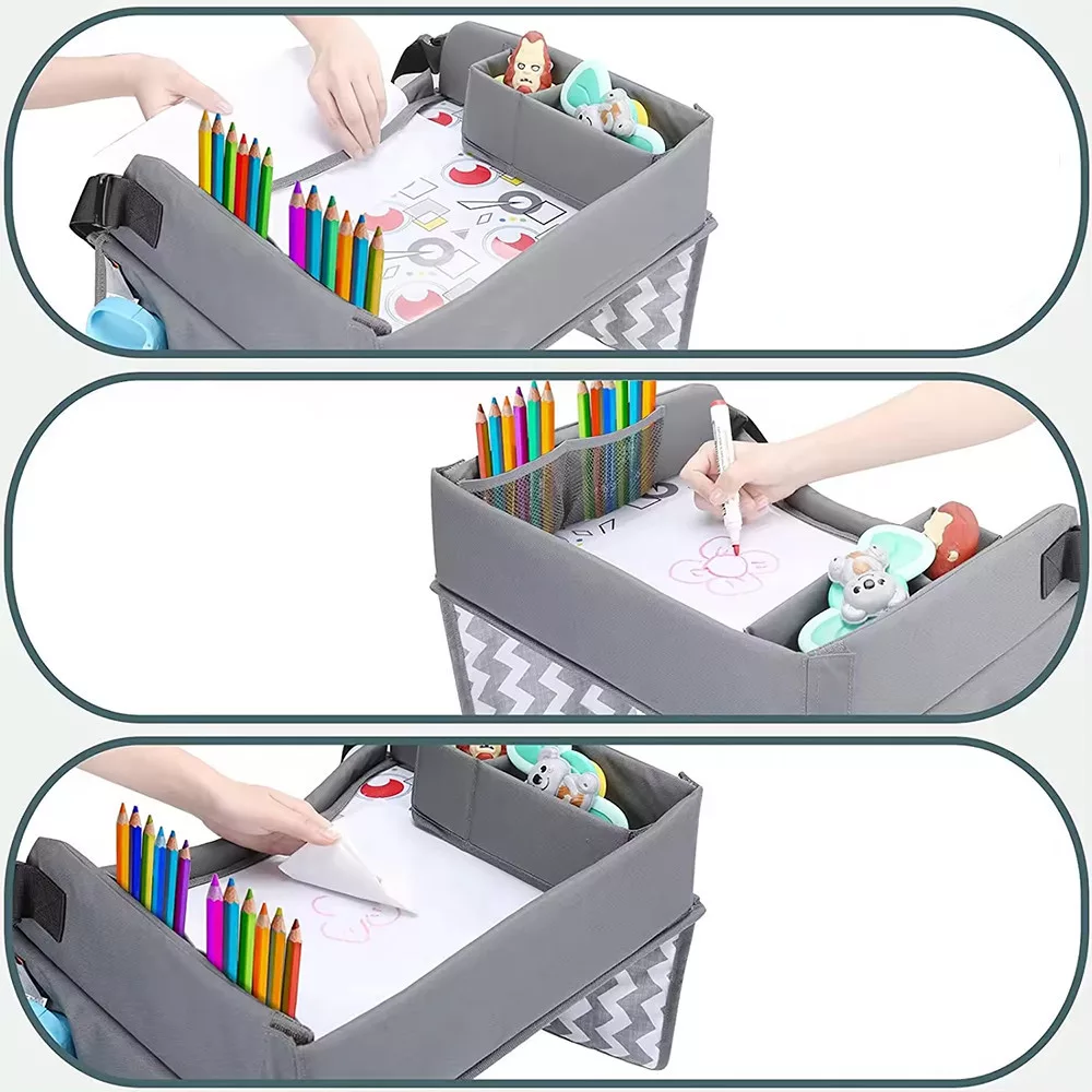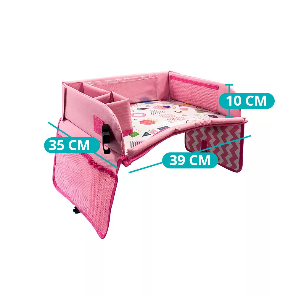 În timpul călătoriilor lungi, masa portabilă oferă o soluție practică pentru depozitarea jucăriilor, instrumentelor de desen sau chiar a unei tablete. Marginea înaltă previne căderea obiectelor, astfel încât copiii se pot juca, desena sau urmări desene animate în liniște.