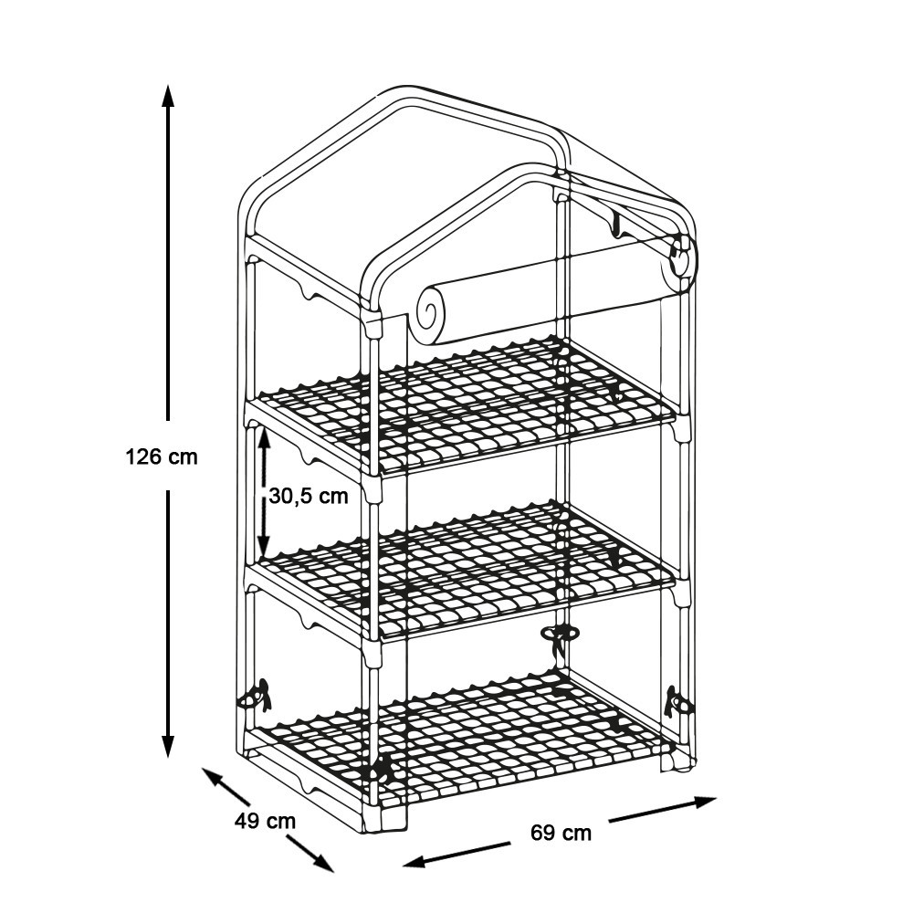 Ușa rulabilă cu fermoar oferă acces facil, iar cele trei rafturi metalice oferă un spațiu bine organizat. Acoperirea transparentă este atât funcțională cât și estetică, integrându-se perfect în orice spațiu exterior.