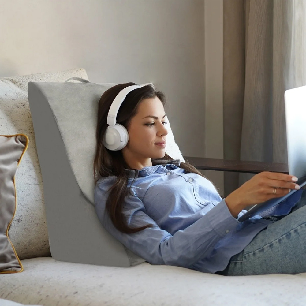 Dacă stai des în pat citind sau uitându-te la televizor, această pernă triunghiulară oferă un suport stabil pentru spate. Designul său susține fără să fie nevoie să ajustezi constant pernele, astfel poți să te relaxezi mai comod.