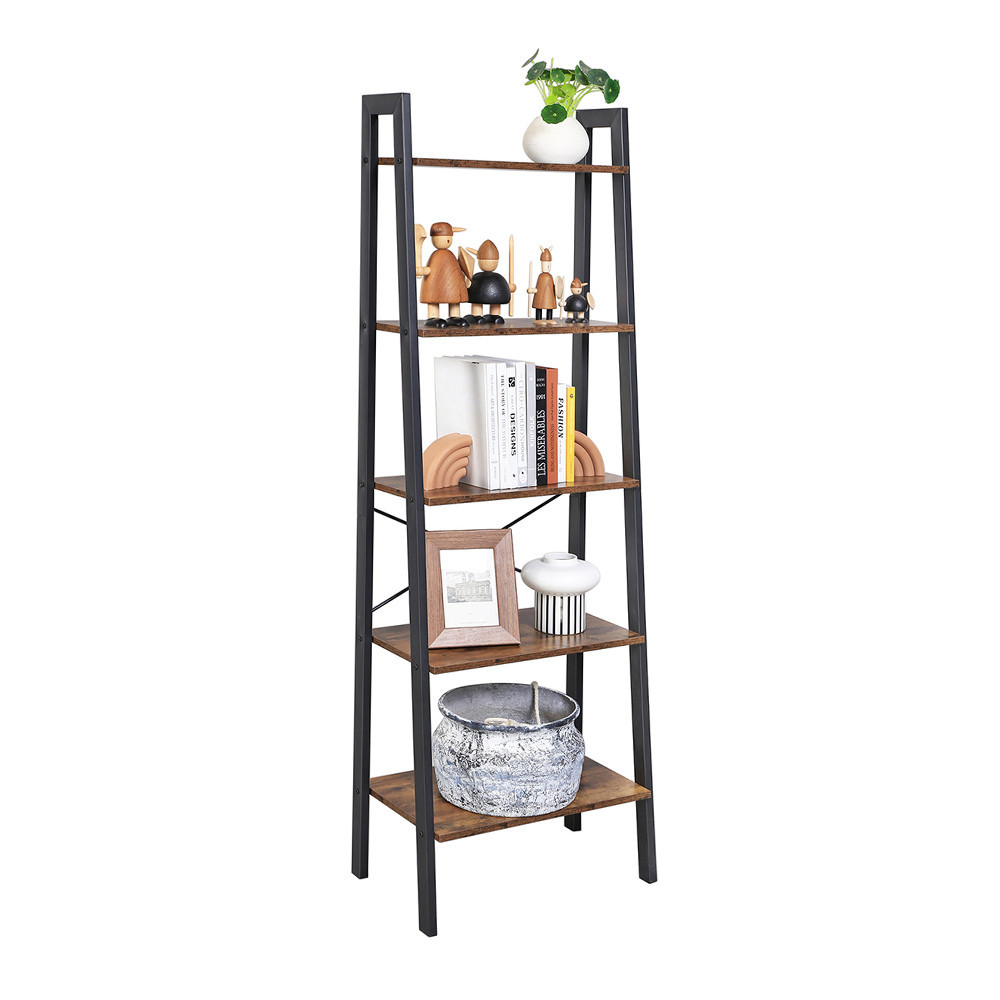 Raftul cu scară dispune de rafturi cu efect de lemn maro rustic și un cadru din oțel negru, adăugând caracter oricărei încăperi. Designul său curat se potrivește perfect în interioare moderne, vintage sau loft, fie că este vorba de un living, birou sau dormitor.