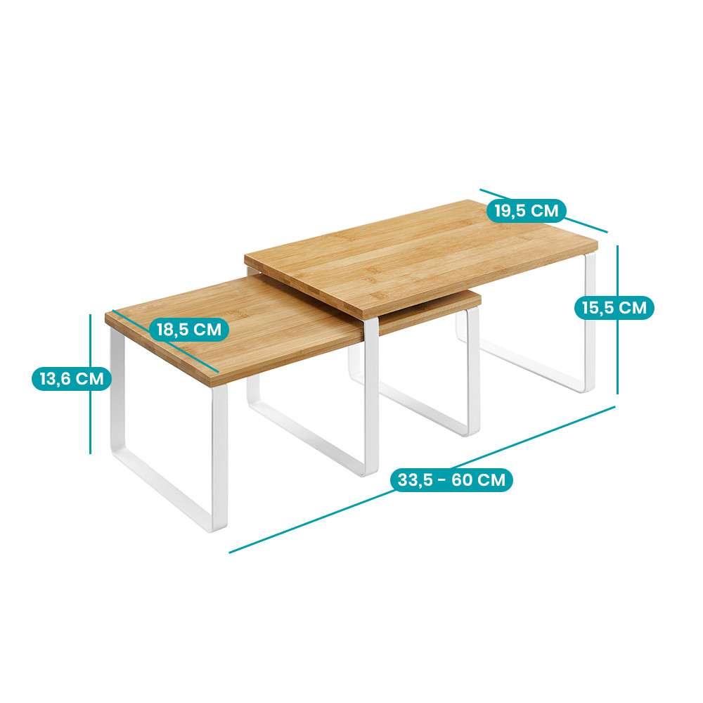 Te-ai săturat de un blat și dulapuri aglomerate? Acest set de rafturi de depozitare, format din 2 piese, te ajută să organizezi condimentele, conservele, cănile sau accesoriile pentru cafea, adăugând în același timp o notă stilată bucătăriei tale prin aspectul său natural.