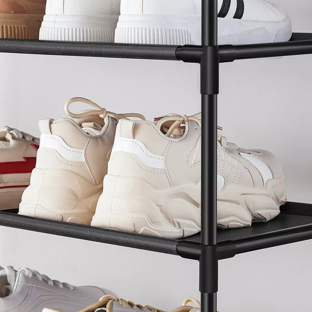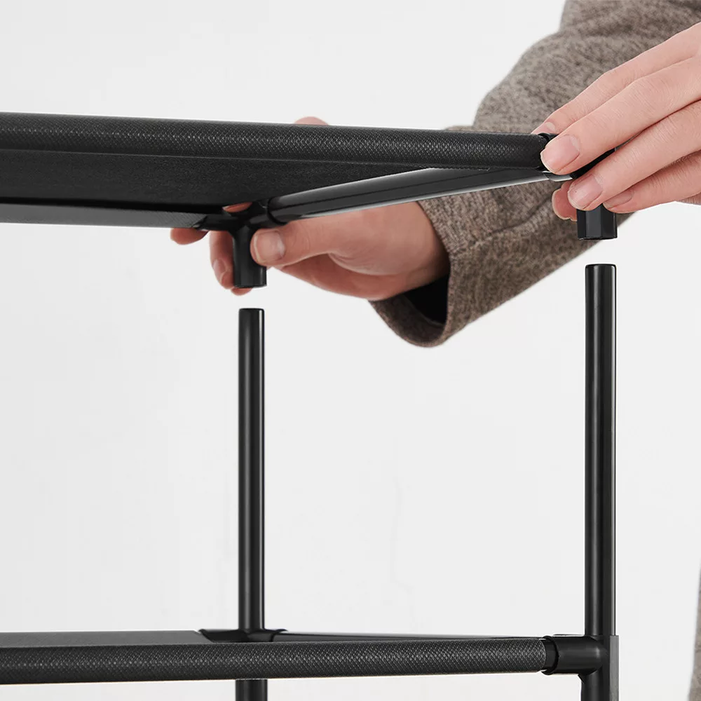 Combinația de tuburi de oțel și rafturi din țesătură nețesută îi conferă un aspect durabil, dar aerisit. Fiecare raft poate susține până la 5 kg, asigurându-se că totul, de la adidași la balerini, este în siguranță.