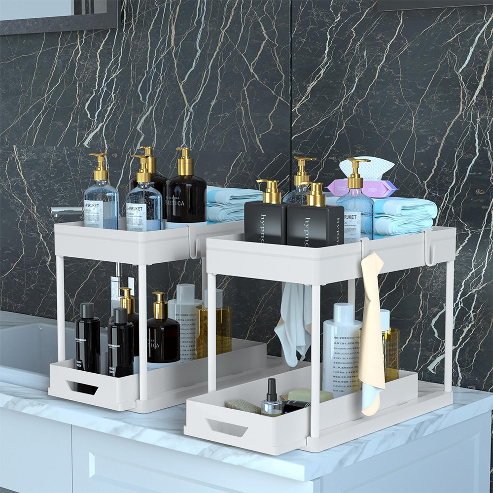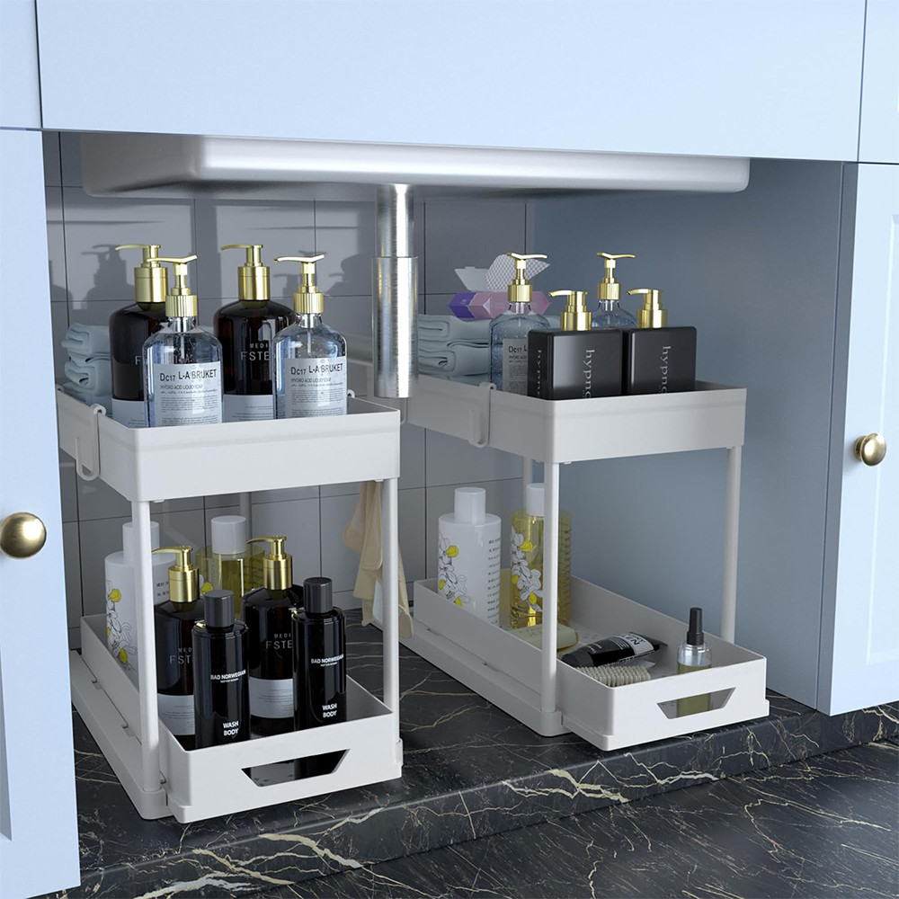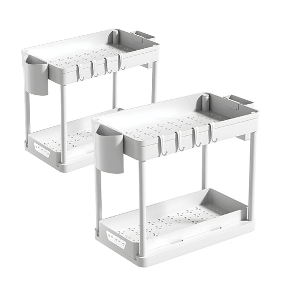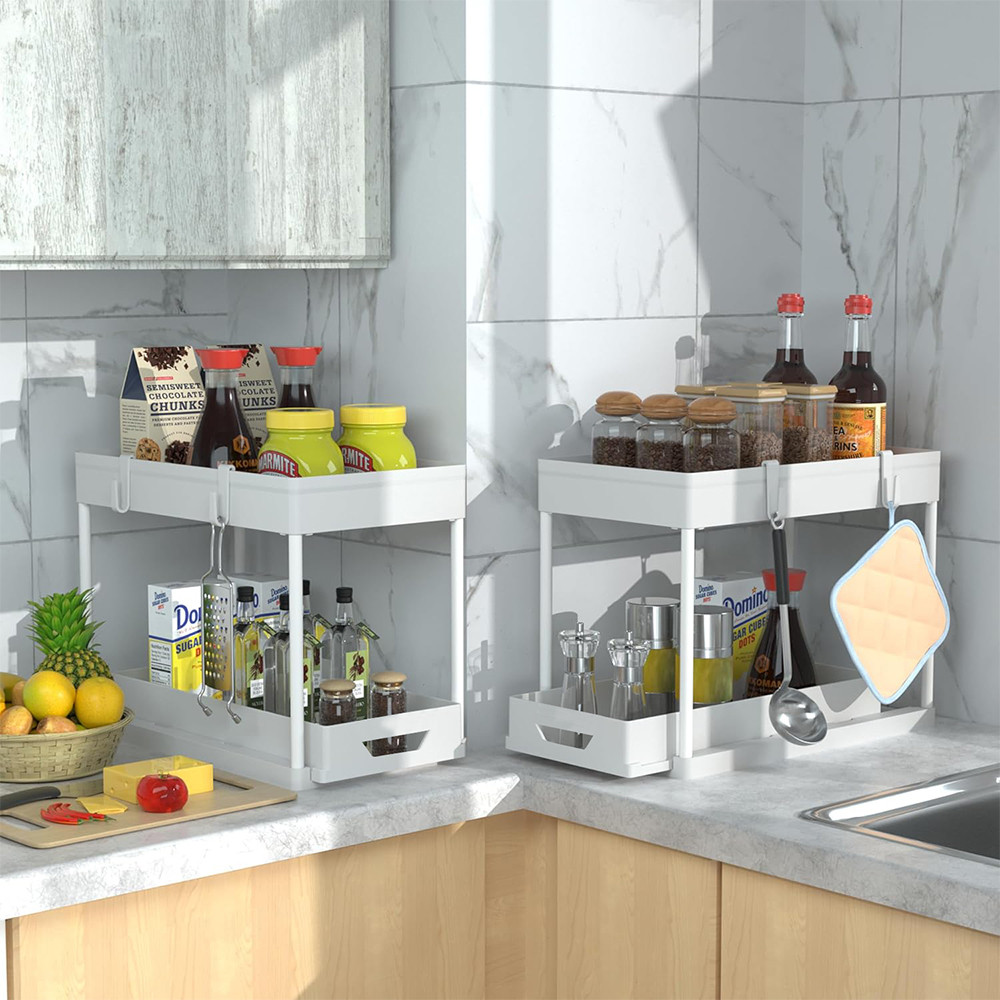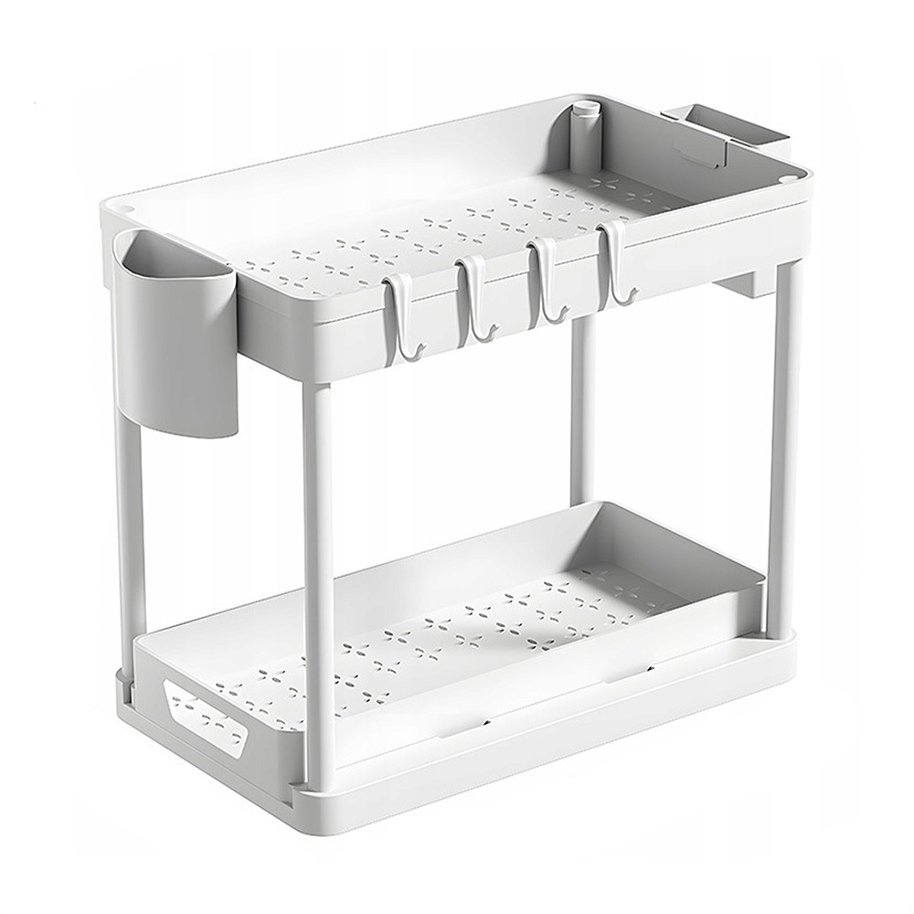 Rafturile pe două niveluri sunt stabile, dar compacte, oferind mult spațiu chiar și pe suprafețe reduse. Cârligele laterale sunt ideale pentru linguri, prosoape de bucătărie sau strecurători.