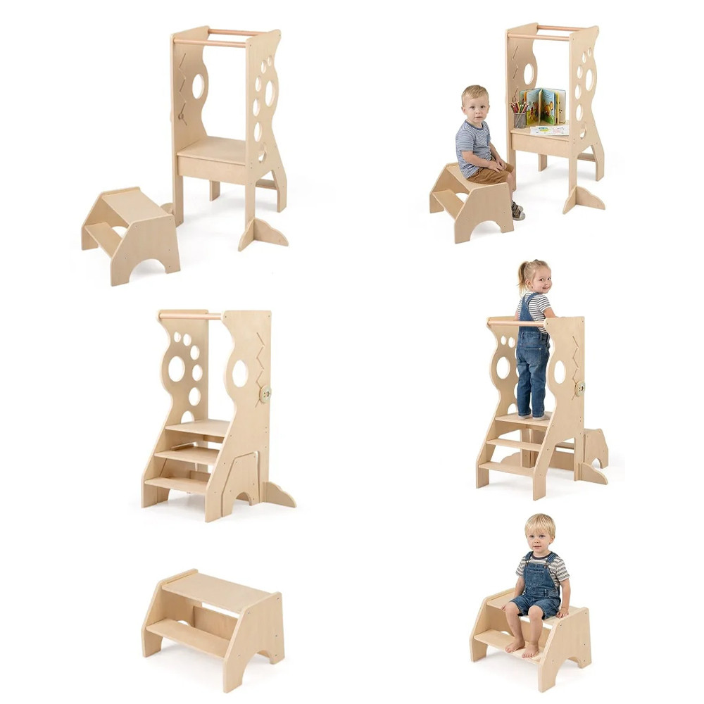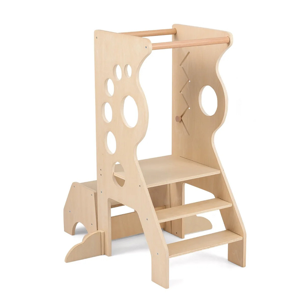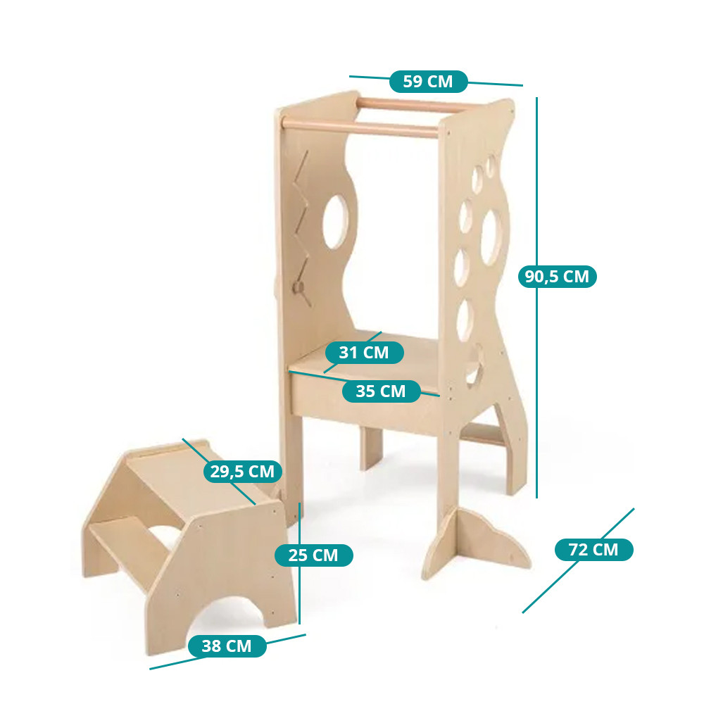 Taburetul cu două trepte inclus poate fi folosit separat sau împreună cu turnul, după cum este nevoie. Dacă este nevoie de mai mult spațiu, taburetul poate fi alunecat, ocupând astfel mai puțin loc. Jocul integrat cu traseu este o activitate bună pentru a le ocupa timpul când așteaptă următorul pas.