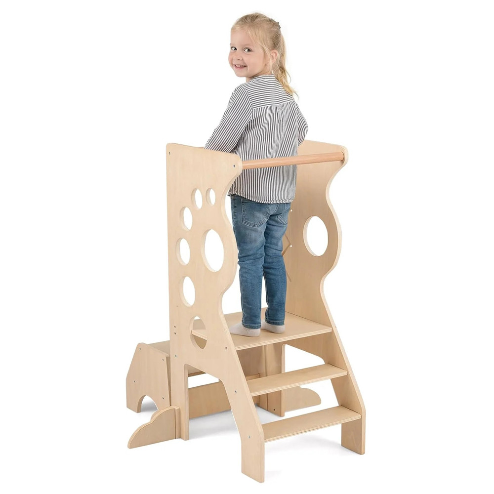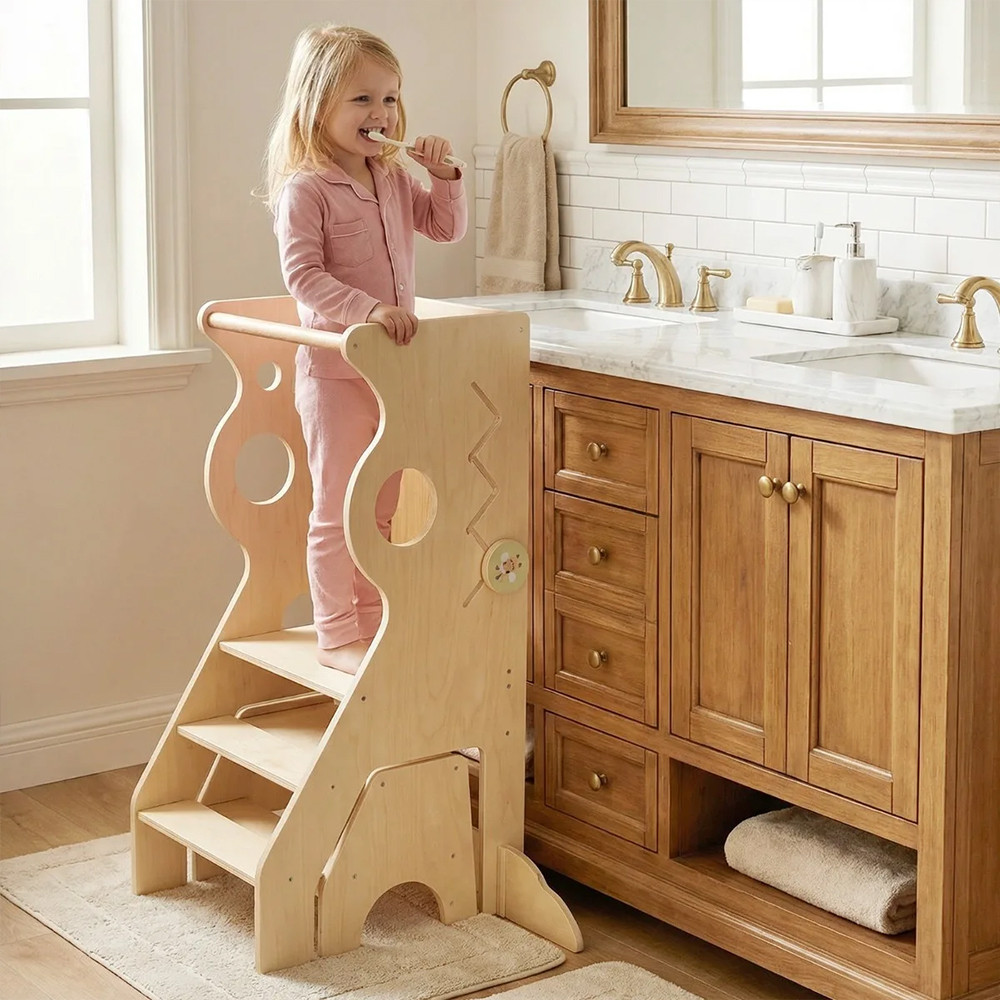 Dacă vrei ca copilul să stea lângă tine la spălat pe mâini, periat dinți sau gătit, această scară este un ajutor de nădejde. Oferă înălțimea necesară pentru a ajunge confortabil la chiuvetă sau la blatul de bucătărie, facilitând includerea în rutina zilnică.