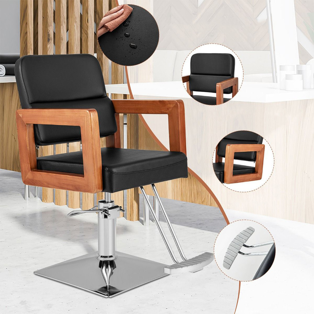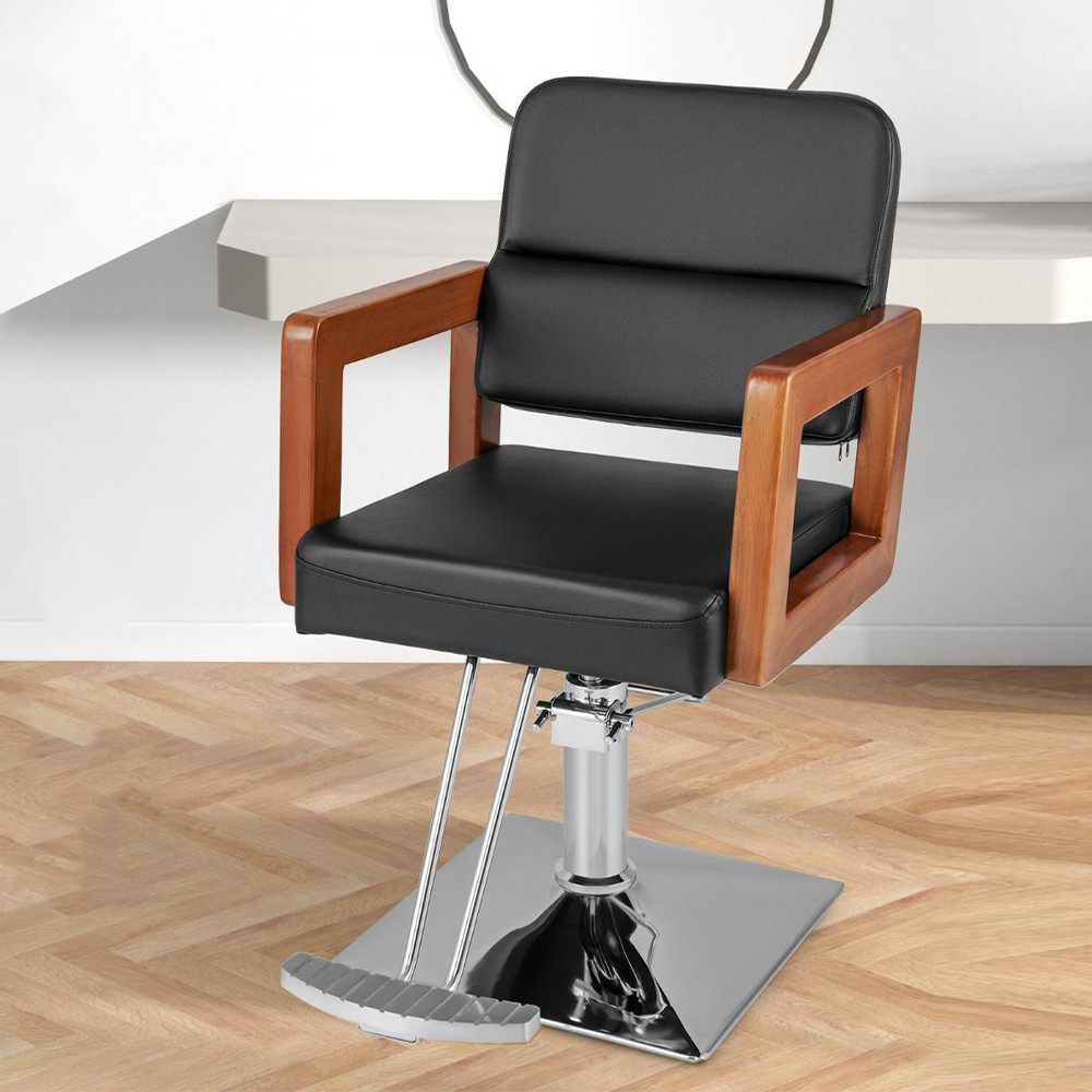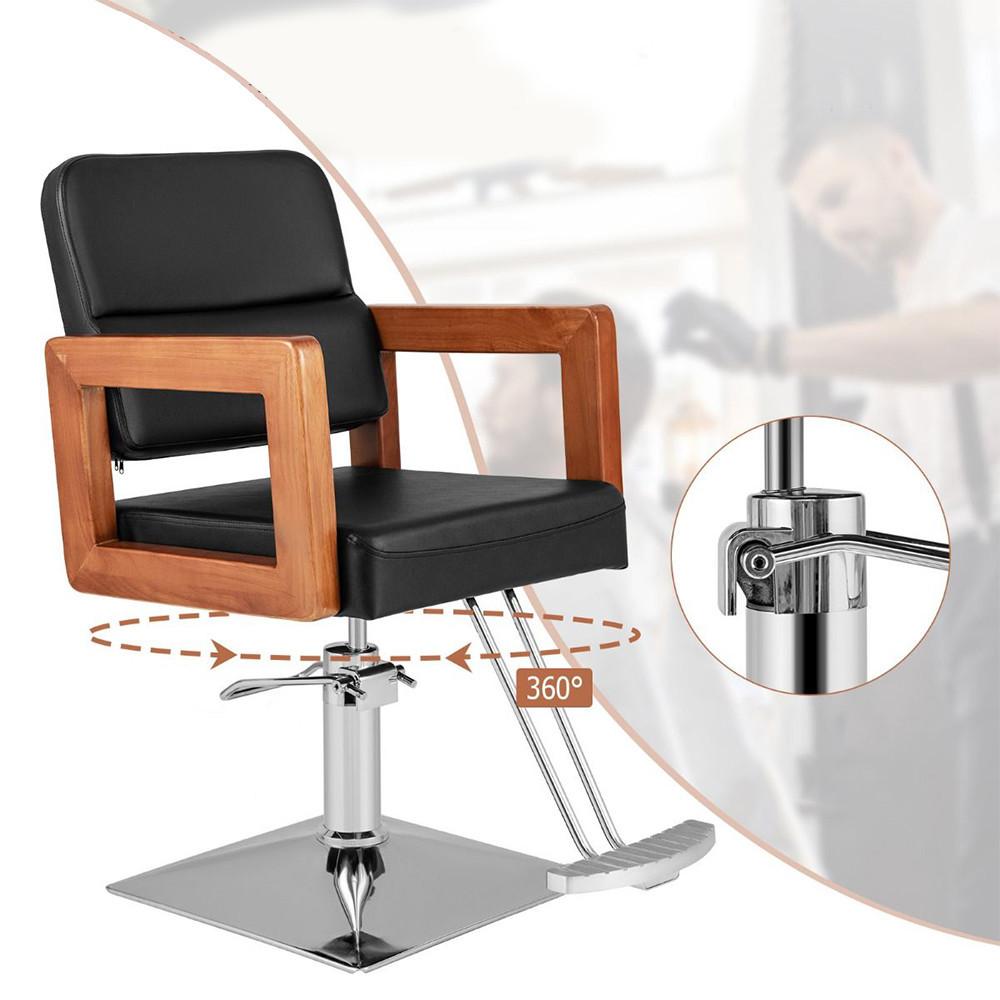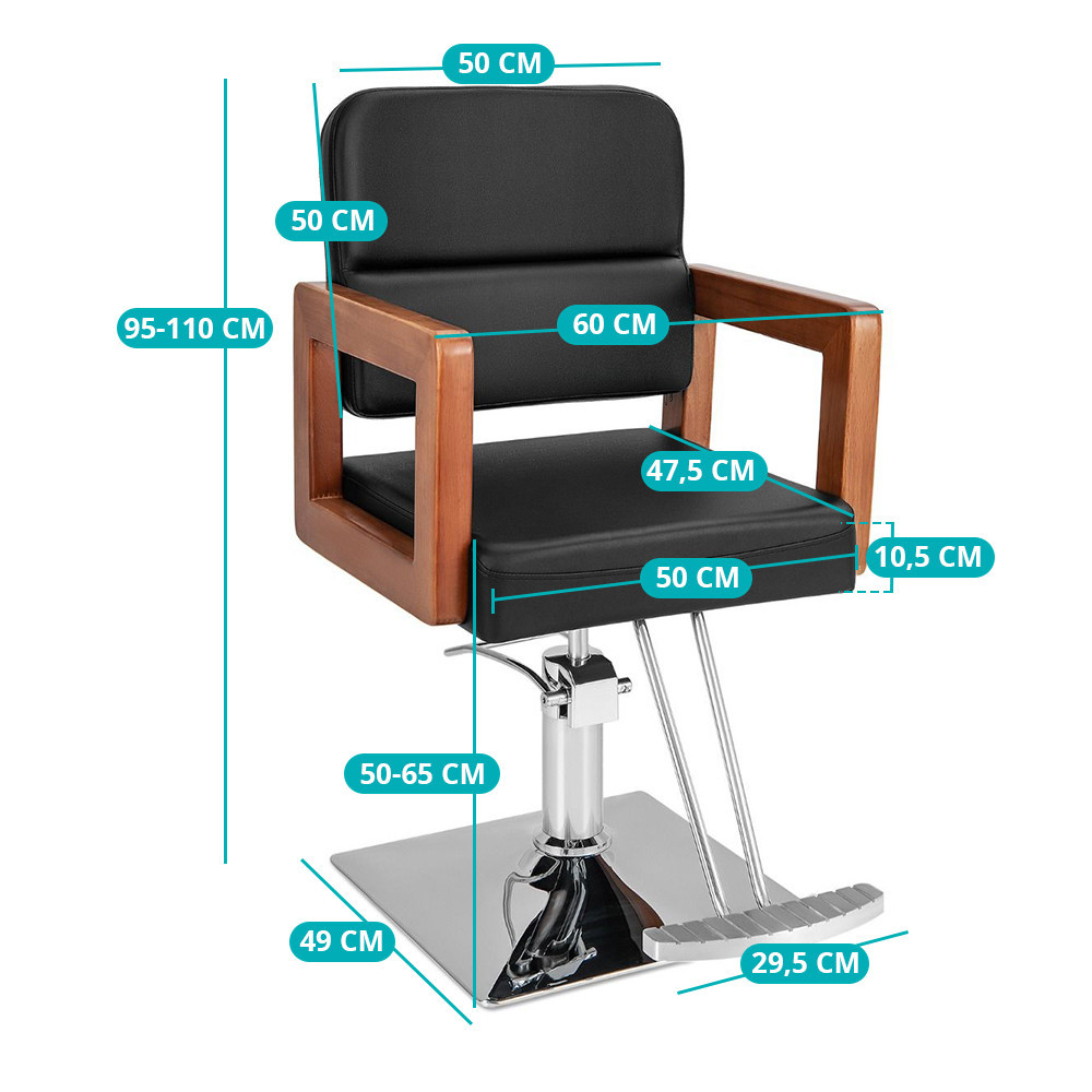 Șezutul și spătarul umplute cu spumă de înaltă densitate asigură confort chiar și în cazul utilizării prelungite. Cotierele din lemn masiv și suportul pentru picioare lat adaugă un plus de confort clientului, iar forma ergonomică facilitează munca frizerului.