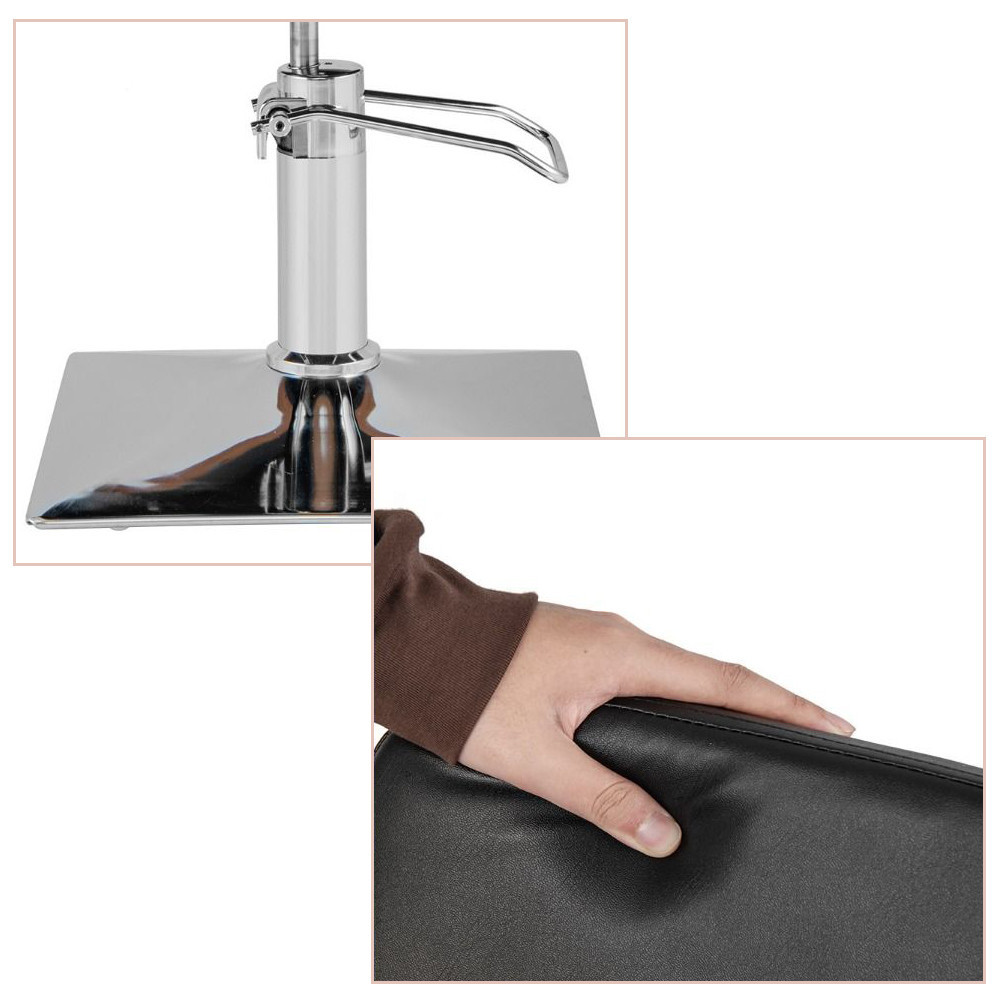 Mecanismul hidraulic permite ajustarea ușoară a înălțimii, astfel încât profesioniștii de orice înălțime să poată lucra confortabil. Scaunul rotativ la 360° poate fi blocat pentru a menține poziția clientului stabilă pe durata serviciului. Tapițeria din piele ecologică PVC este impermeabilă și rezistentă la uzură, fiind ușor de curățat – un aspect esențial pentru utilizarea zilnică într-un salon. Materialul nu absoarbe lichidele și rezistă la substanțe chimice, menținând aspectul nou al scaunului pentru o perioadă îndelungată.