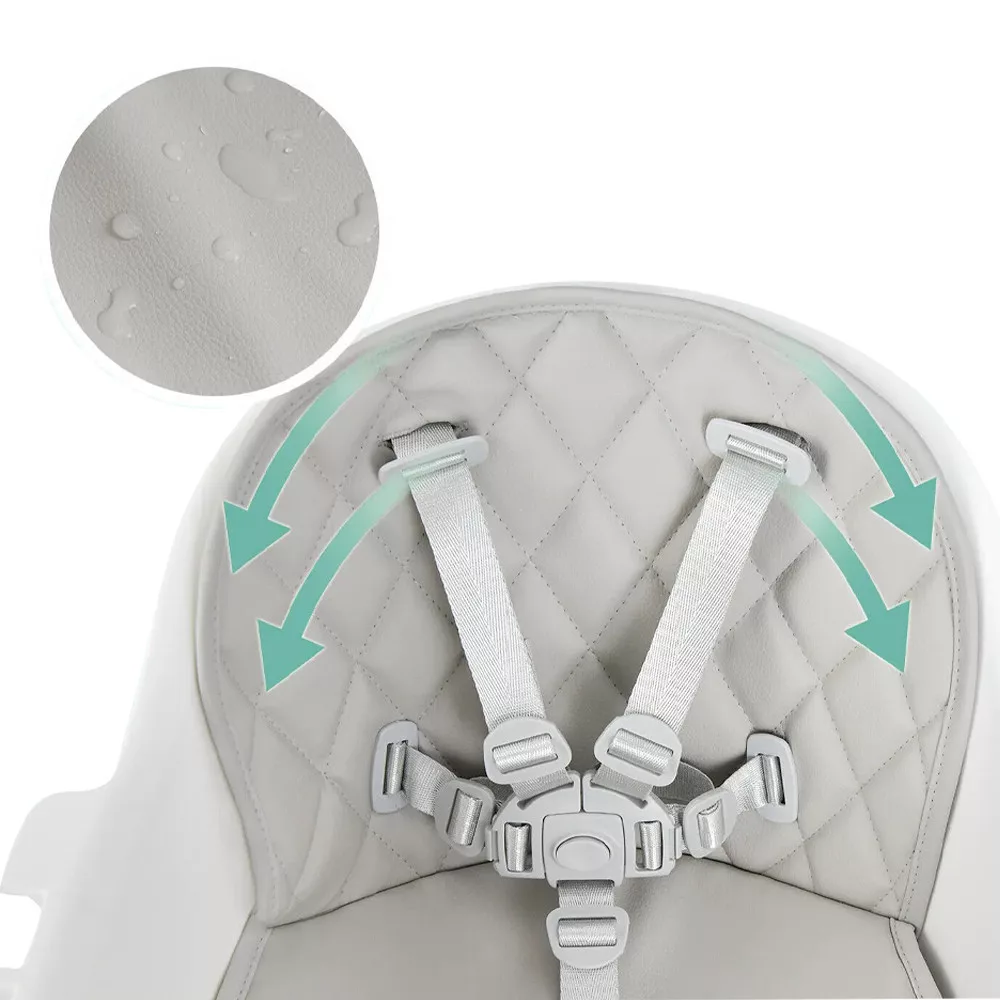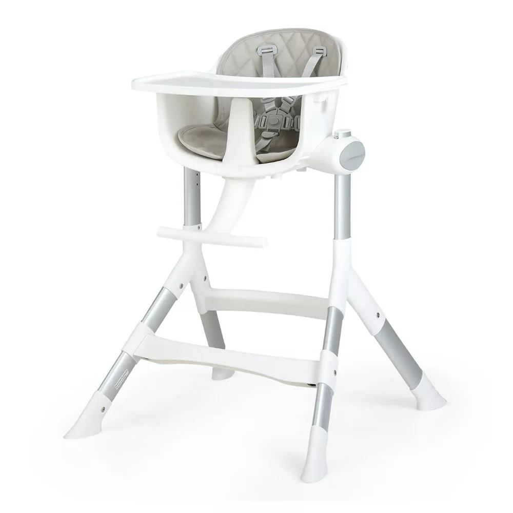 Cadru din aluminiu, robust dar ușor, oferă suport de încredere, în timp ce picioarele late cu tălpi antiderapante asigură stabilitate maximă. Centura de siguranță în 5 puncte integrată și marginea anti-răsturnare oferă protecție suplimentară în timpul meselor sau jocului.
