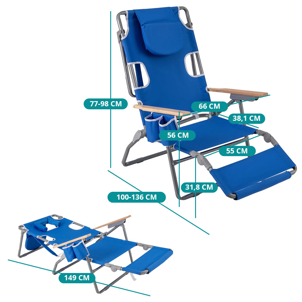 Dacă cauți un loc confortabil pentru a te așeza sau întinde pe plajă, la camping sau pe terasa ta, acest scaun este partenerul perfect. Poți sta pe el pentru conversații, te poți înclina pentru un pui de somn sau te poți întinde complet pentru bronzat.