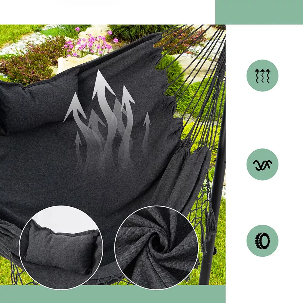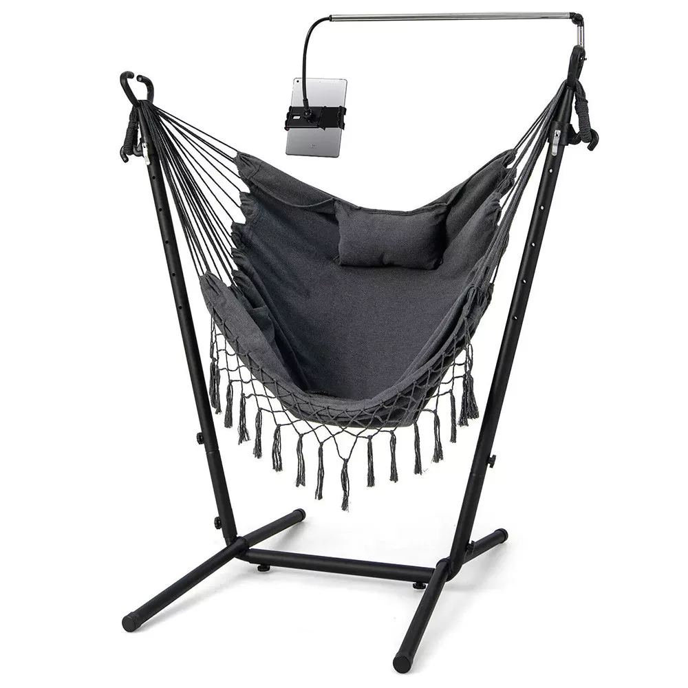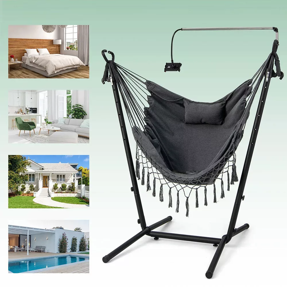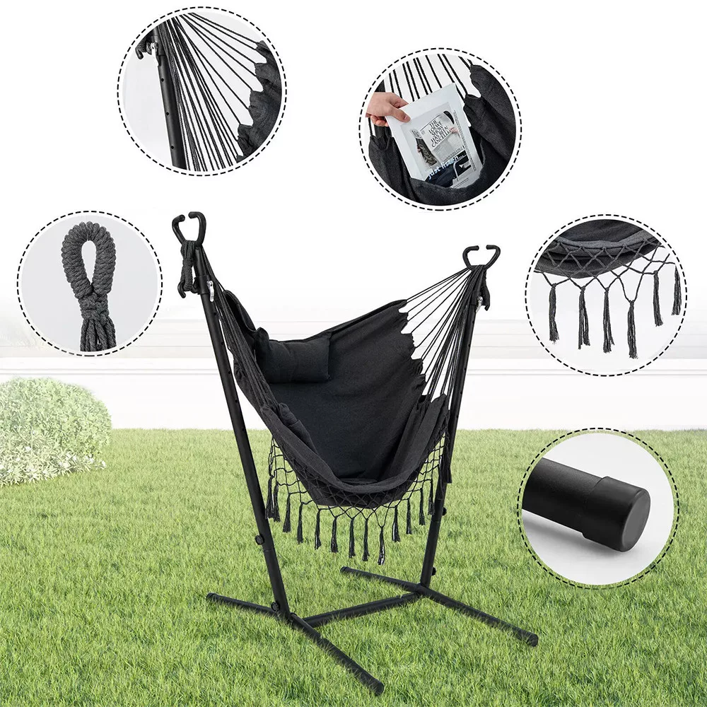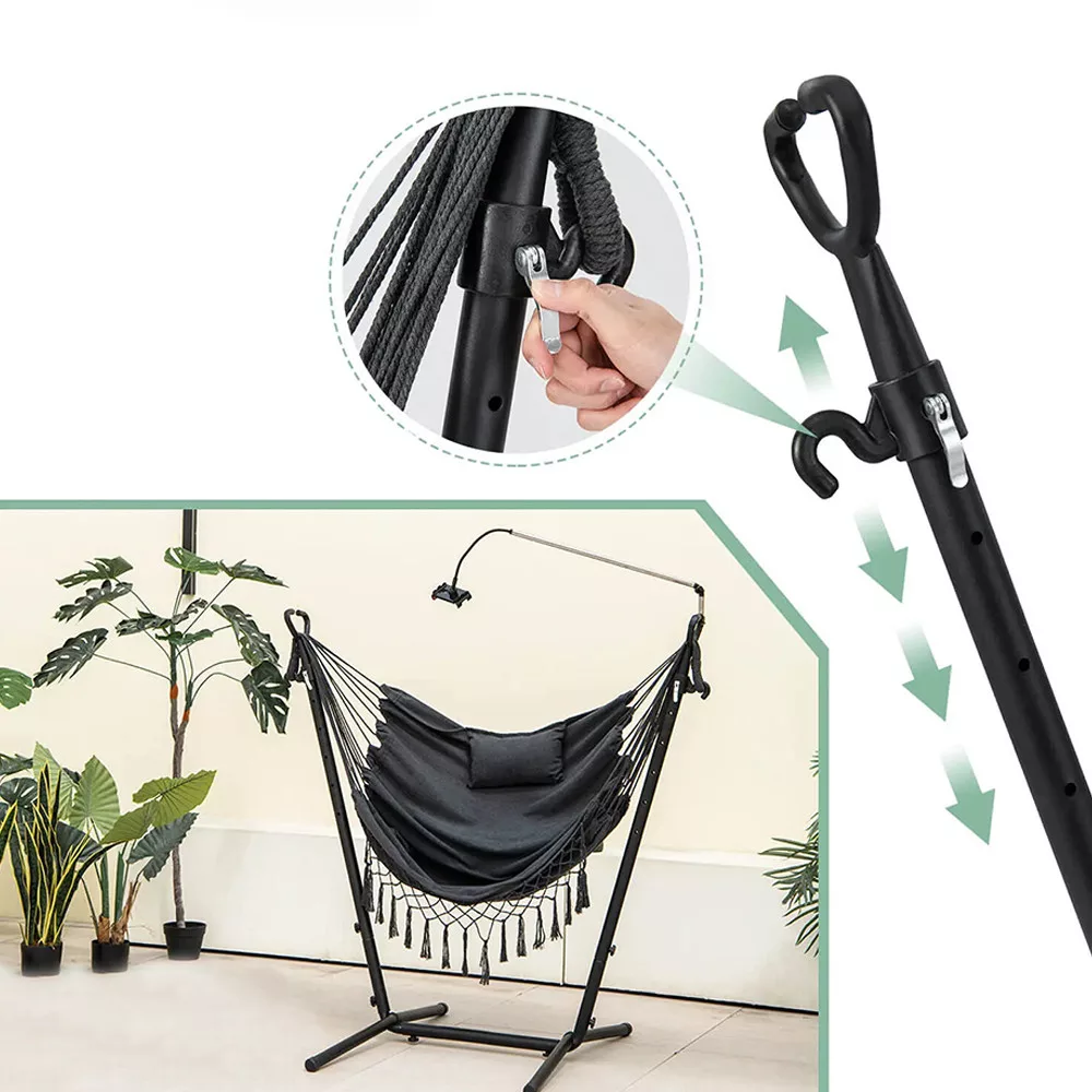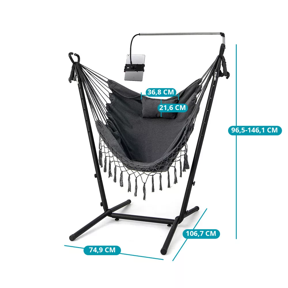 Datorită cârligelor cu eliberare rapidă, scaunul suspendat poate fi ajustat la 6 niveluri diferite de înălțime. Este ușor de personalizat în funcție de nevoile tale, fie că îl folosești pentru odihnă sau relaxare.