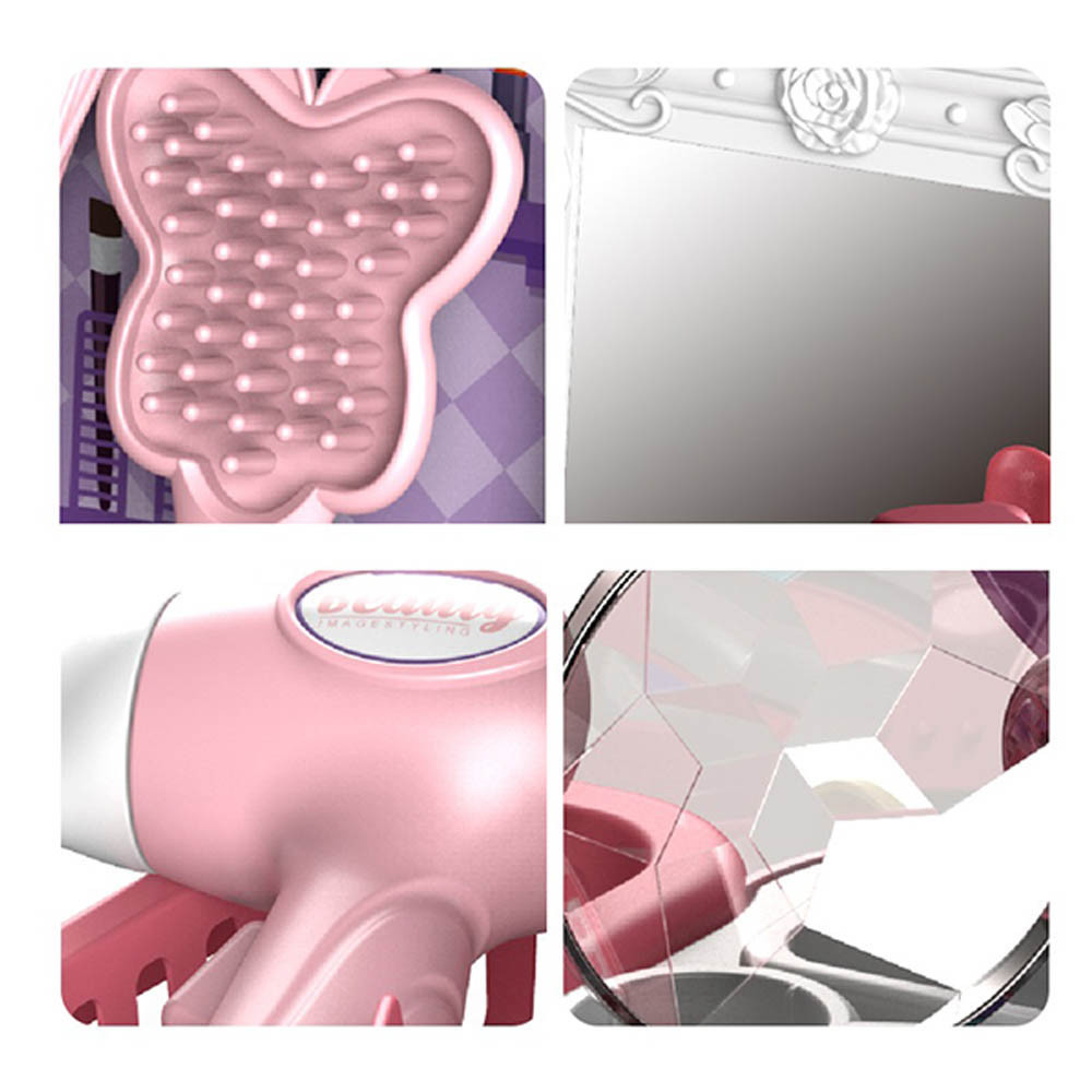 Setul de frumusete de jucarie va fi in scurt timp un mare favorit pentru fiecare fetita! Cutia este pliabila si datorita manerelor este usor de transportat, astfel incat copii o pot lua oriunde cu ei. Cosurile, suporturile sale mici, precum si autocolantele care infatiseaza accesorii de toaleta, evoca o atmosfera unui salon de infrumusetare. Deblocat contine multe accesorii si consumabile realiste, cum ar fi o oglinda mica, paleta de machiaj si uscator de par.