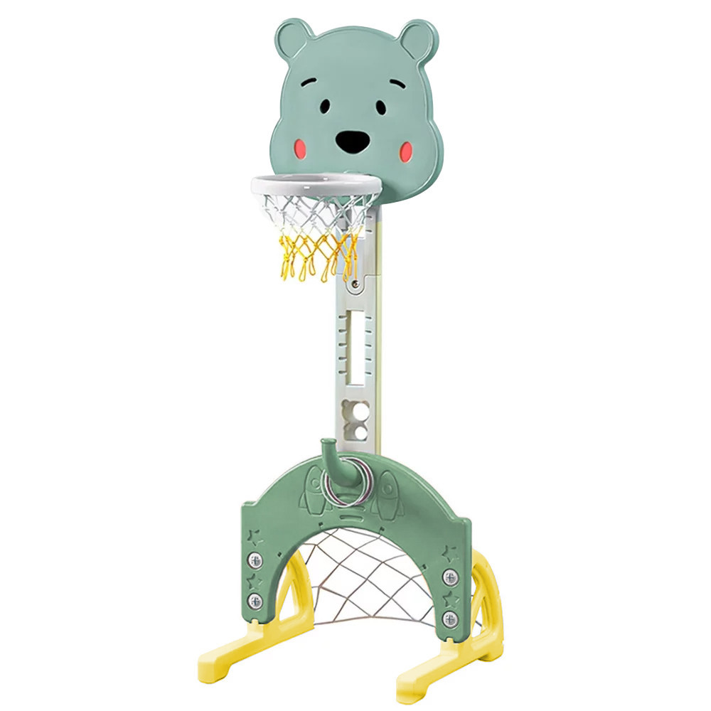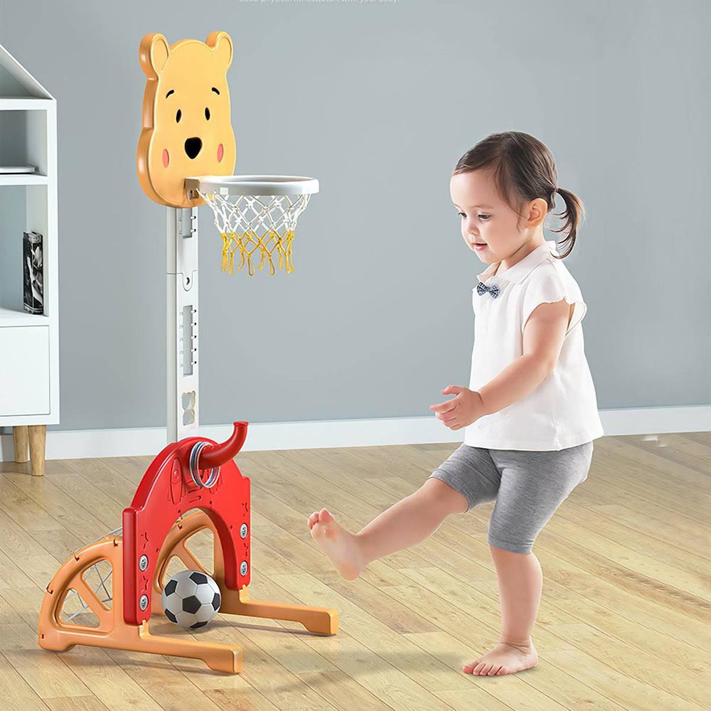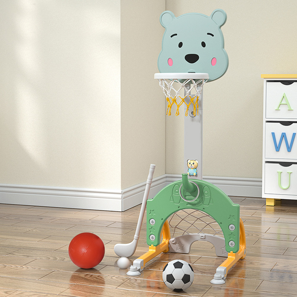 Acest set de joc oferă patru activități sportive diferite într-un singur suport. Secțiunea de baschet dispune de un panou cu înălțime reglabilă, adaptabil la dezvoltarea copilului. Fotbalul este echipat cu o poartă de dimensiuni reduse, ideală pentru primele șuturi și exersarea tehnicii de țintire. Jocul de aruncare a inelelor ajută la dezvoltarea preciziei și a coordonării mână-ochi, în timp ce golful contribuie la învățarea tehnicilor de lovire de bază și la îmbunătățirea concentrării.