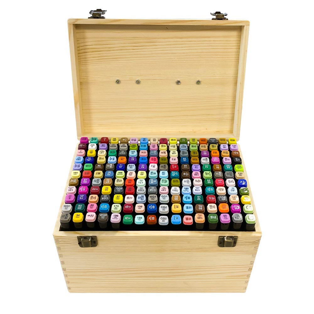 Cutia din lemn este rezistentă și ușor de transportat, menținând markerele organizate și protejate. Capacul cu închidere metalică și mânerul comod asigură o manipulare și un transport simplu.