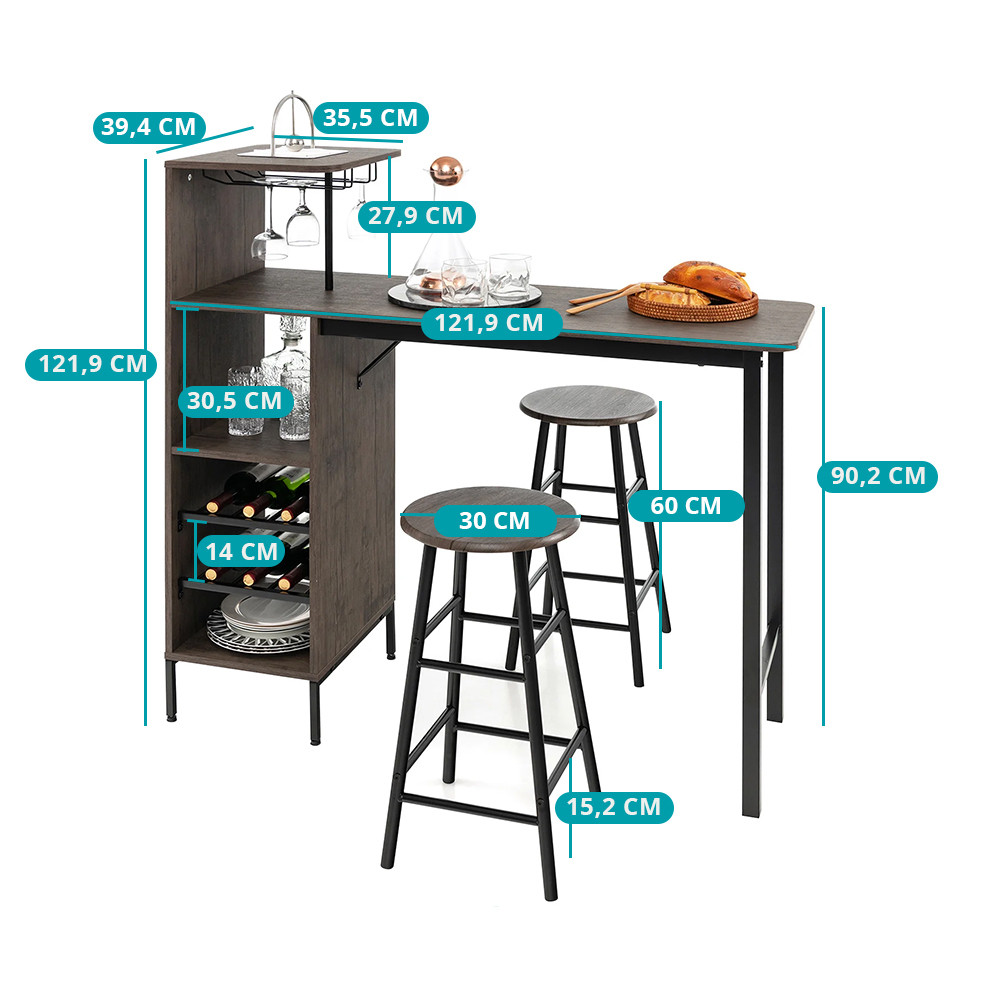 Masa dispune de un raft pentru vin și un suport pentru pahare pe lateral, capabil să stocheze până la 6 sticle de vin și diverse tipuri de pahare. Cele trei rafturi laterale oferă suficient spațiu pentru ustensile, accesorii de bucătărie sau obiecte decorative, menținând totul la îndemână.