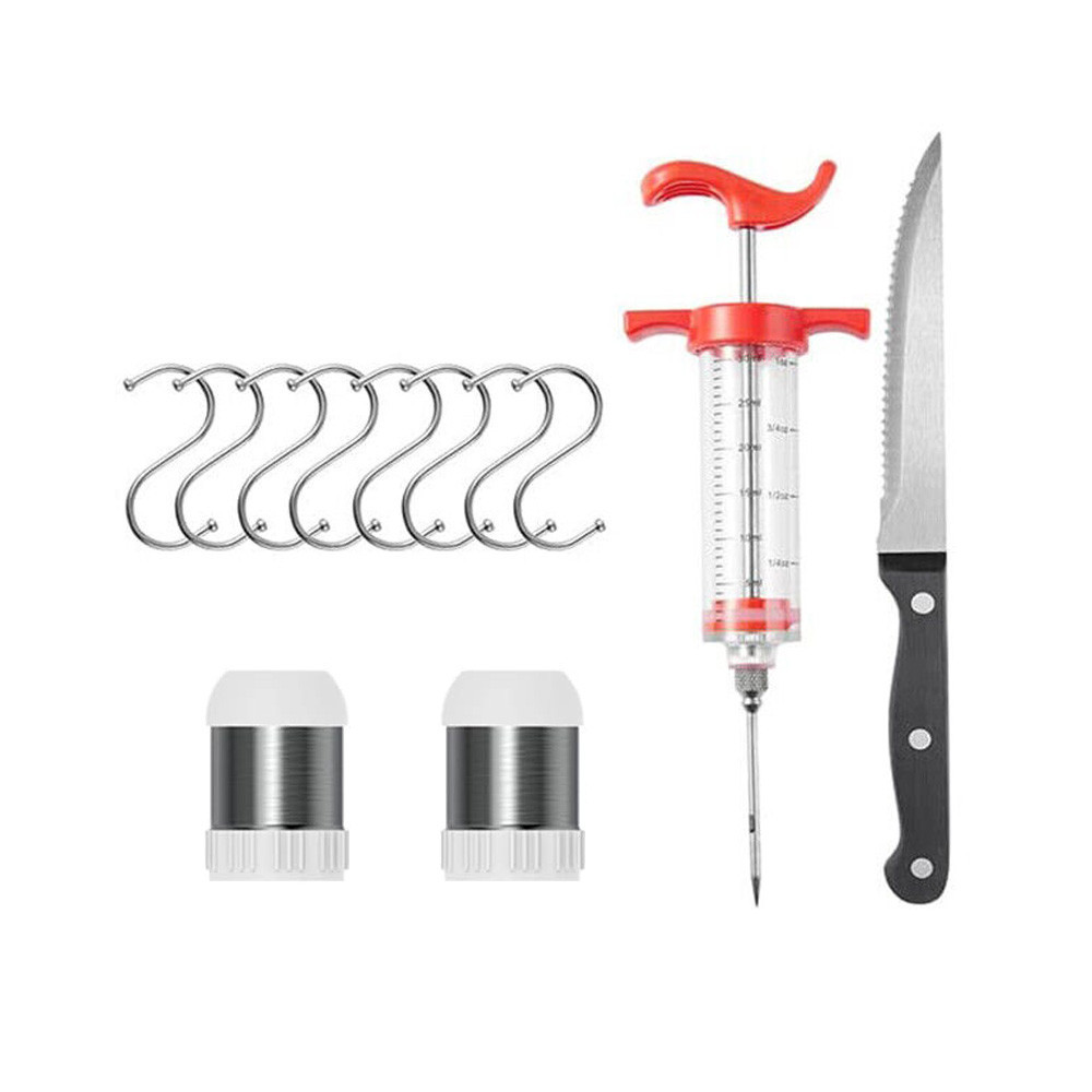 Setul BBQ de 134 de piese include toate accesoriile necesare pentru o experiență completă de grătar: spatule, furculiță, seringă de marinadă, șorț, bețișoare din bambus și multe altele.