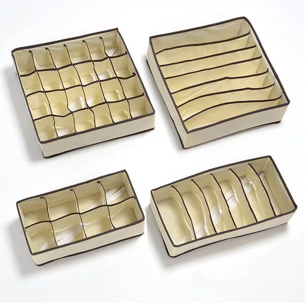 Setul include patru cutii de dimensiuni diferite, adaptabile oricărui tip de spațiu. Potrivite atât pentru sertare mici, cât și pentru compartimente mai mari, compartimentele te ajută să separi și să organizezi diferitele articole vestimentare.