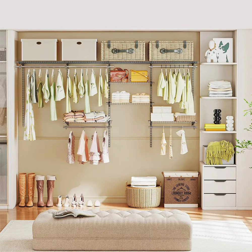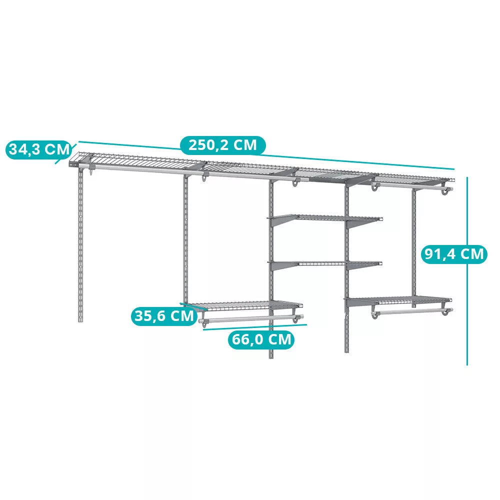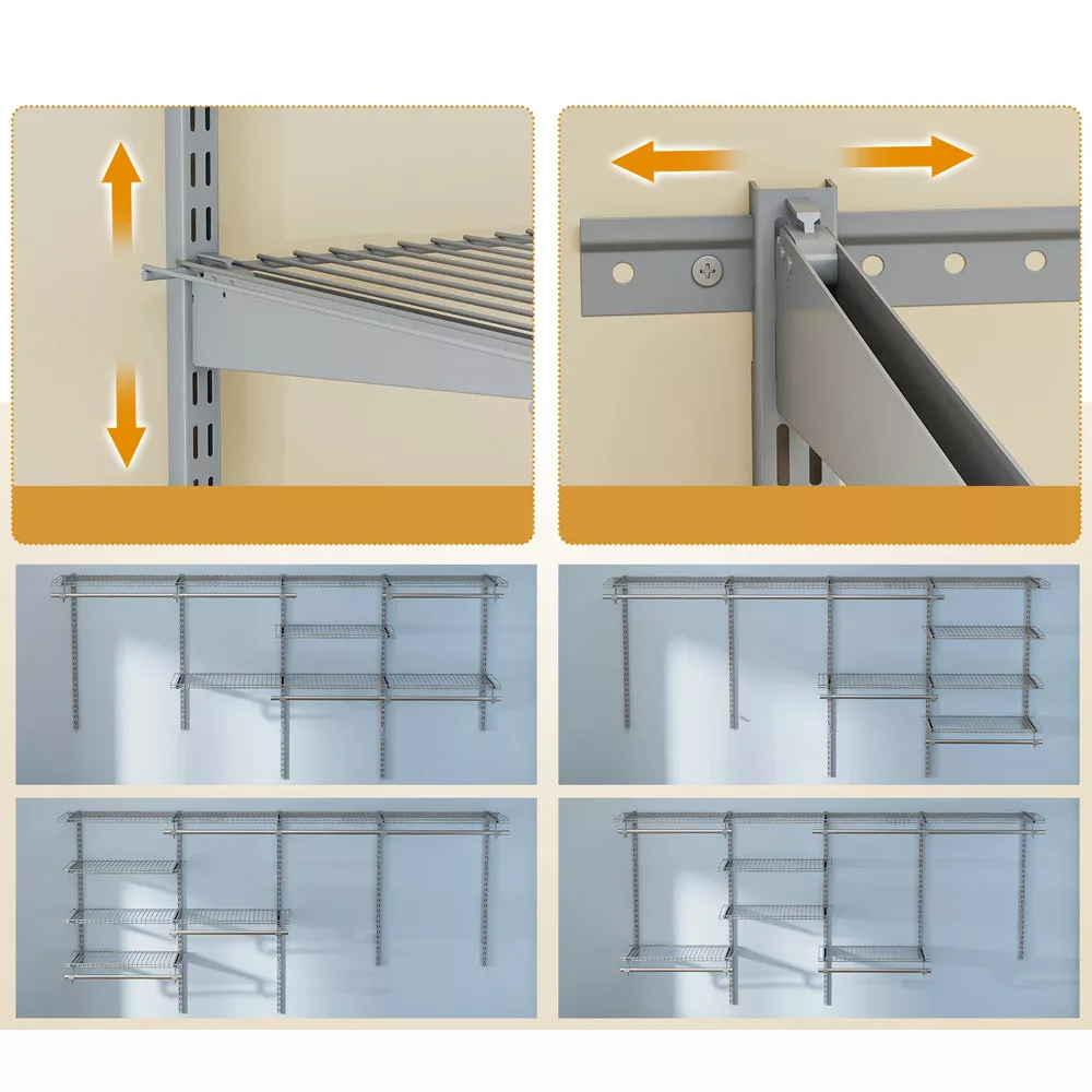 Sistemul se potrivește garderobelor cu lățimi cuprinse între 122 și 244 cm, permițând o configurare personalizată. Înălțimea și aranjamentul rafturilor și barelor pot fi ajustate pentru a se potrivi nevoilor individuale, permițând fiecăruia să își adapteze spațiul de depozitare conform preferințelor.