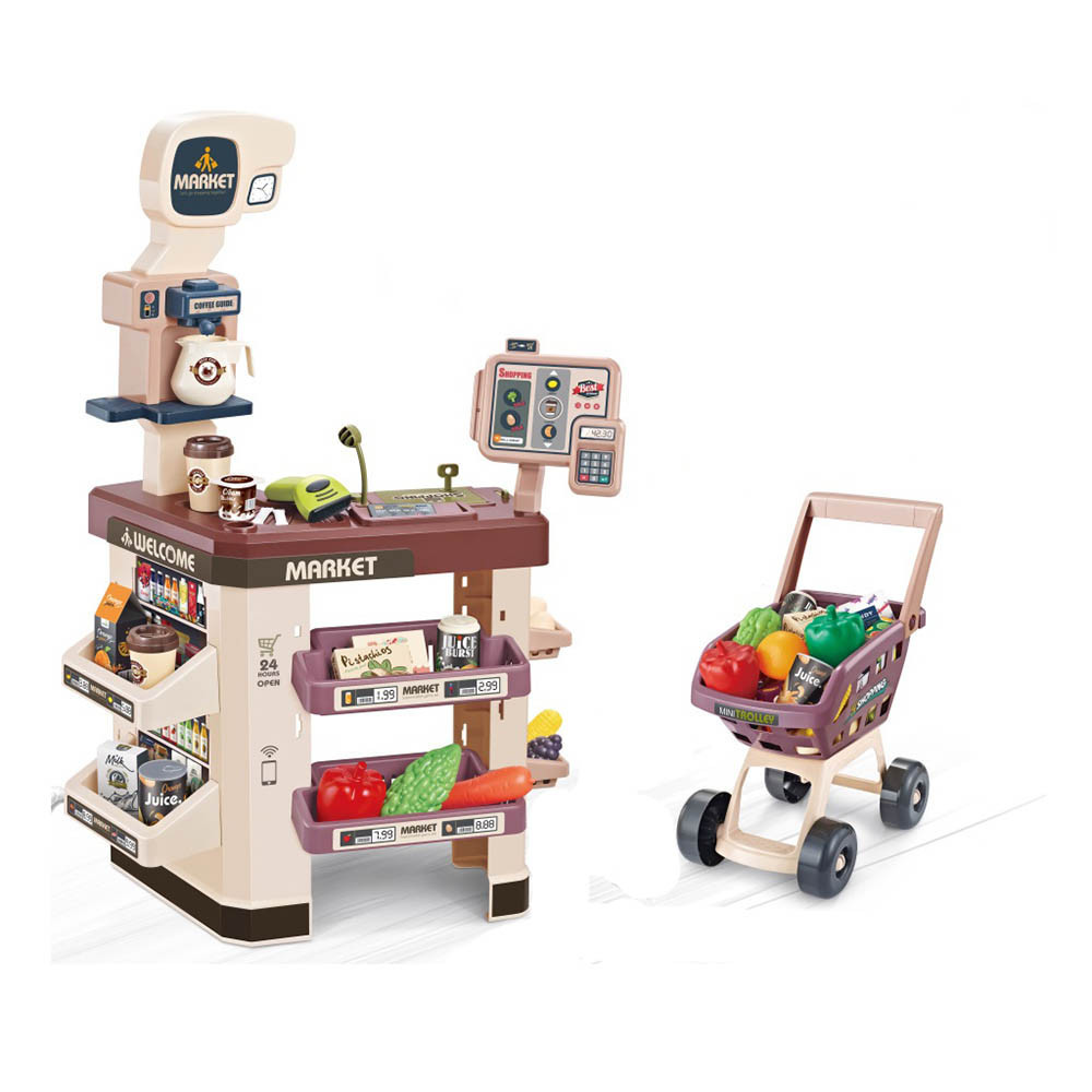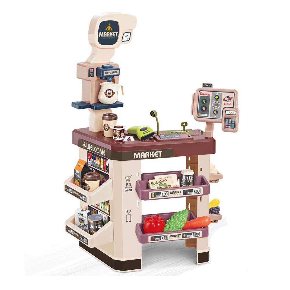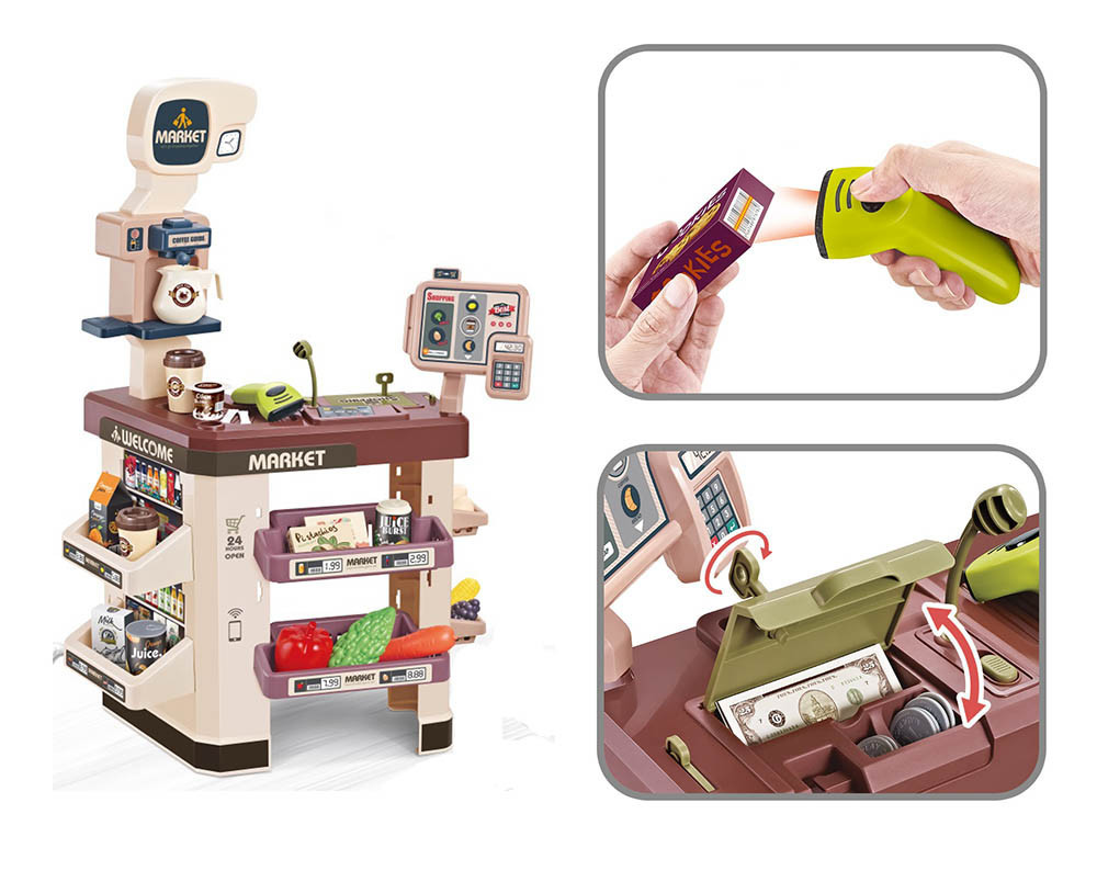 Setul contine: bani de jucarie, legume si fructe de jucarie, alimente si bauturi de jucarie, Pentru functionare sunt necesare 5 baterii AA de 1,5 V.