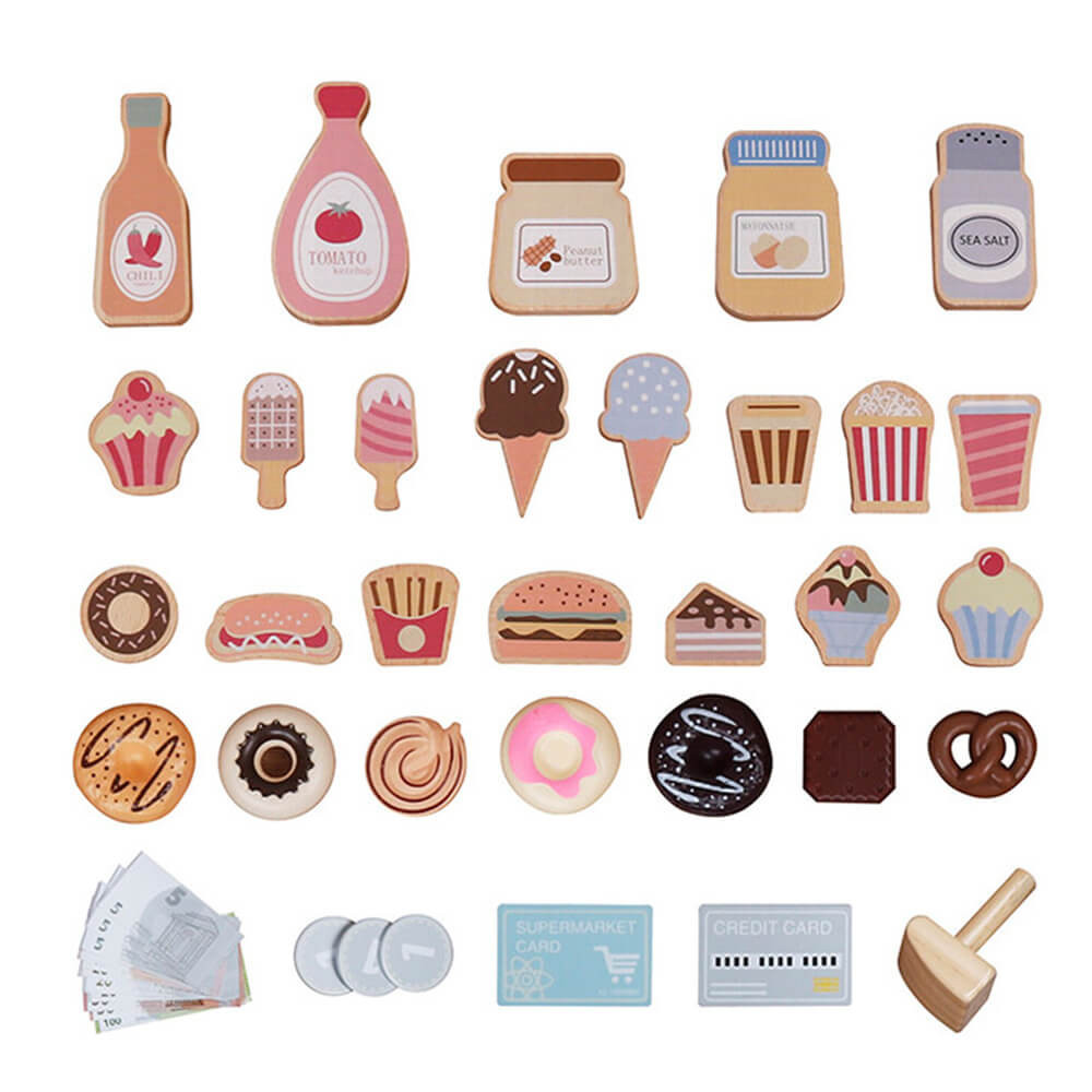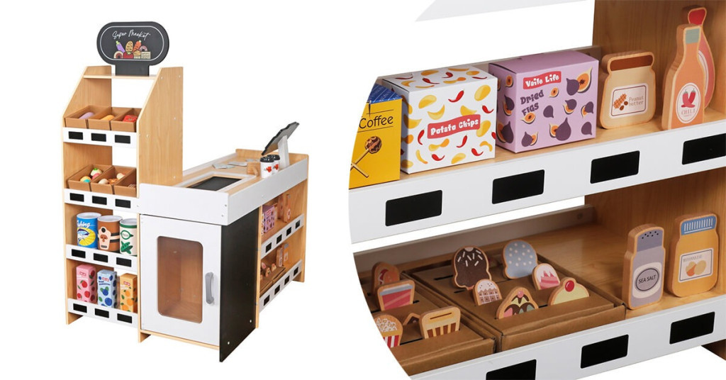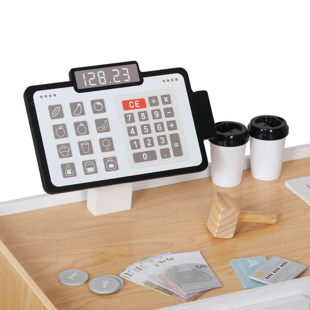 În acest supermarket de jucărie din lemn, detaliat și realist, copiii pot deveni mici vânzători: pot aranja rafturile, cântări produsele, folosi casa de marcat sau servi clienții. Situațiile cotidiene devin experiențe distractive cu elementele naturale din lemn.